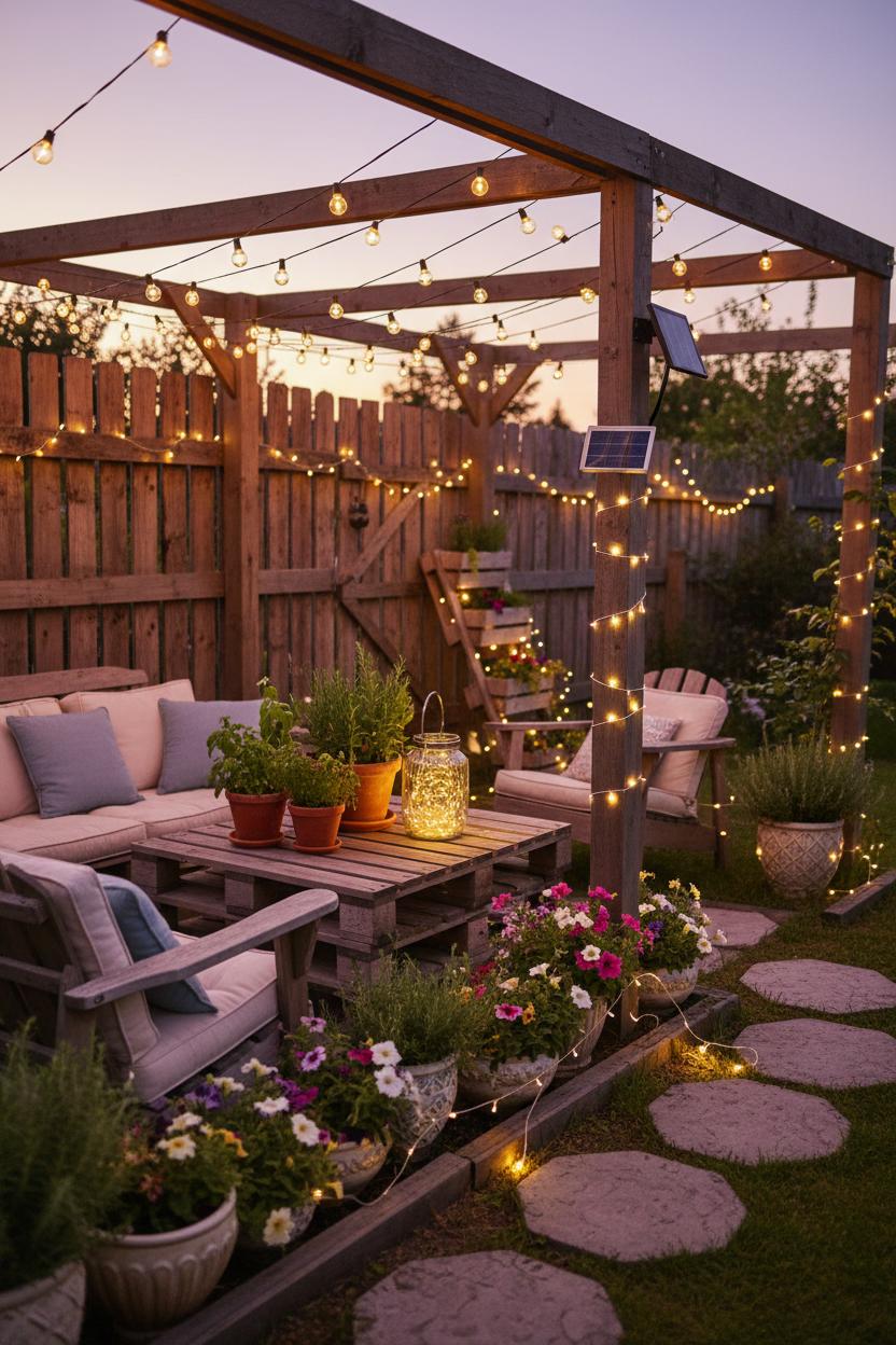 When the sun slips behind the fence and the air goes soft and lavender, nothing makes a patio feel more like a little outdoor living room than a canopy of solar string lights. They’re the easiest win in the whole list of garden diy ideas because there’s no wiring, no outlets to hunt for—just a small solar panel sipping daylight and strands of warm glow waiting to flicker on at dusk. Choose warm white bulbs for that café-bistro vibe, and look for weatherproof, shatter-resistant strands with multiple modes so you can pick a steady gleam or a subtle twinkle. Mount the panel where it gets full sun and drape the lights overhead in a zigzag, trace them along a fence line, or spiral them around a pergola post. If you’ve built a backdrop from pallet wood or styled a rustic pallet planter beside your seating area, let the lights kiss those textures so the grain and greenery catch a gentle highlight—instant outdoor decor that feels curated but effortless.