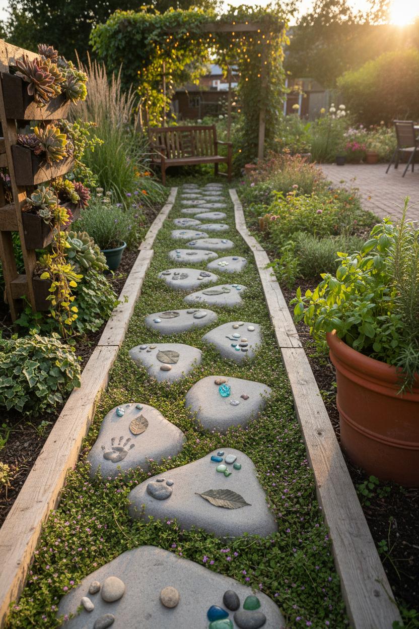 For finishing touches, tuck creeping thyme between stones for that soft, cottage feel and let the path lead to a vertical pallet planter or a sunny herb planter brimming with basil and mint. At dusk, drape solar string lights along the route or weave them through nearby shrubs for a gentle glow that turns your walkway into a nighttime moment. Seal the stones if you like, and invite little hands to add leaf prints or even pet paw impressions to make it personal. This simple project connects different spaces—patio to herb garden, lawn to reading bench—while layering in texture and warmth, and it pairs beautifully with all your other backyard projects on the list. Consider it the thread that ties your outdoor decor together.