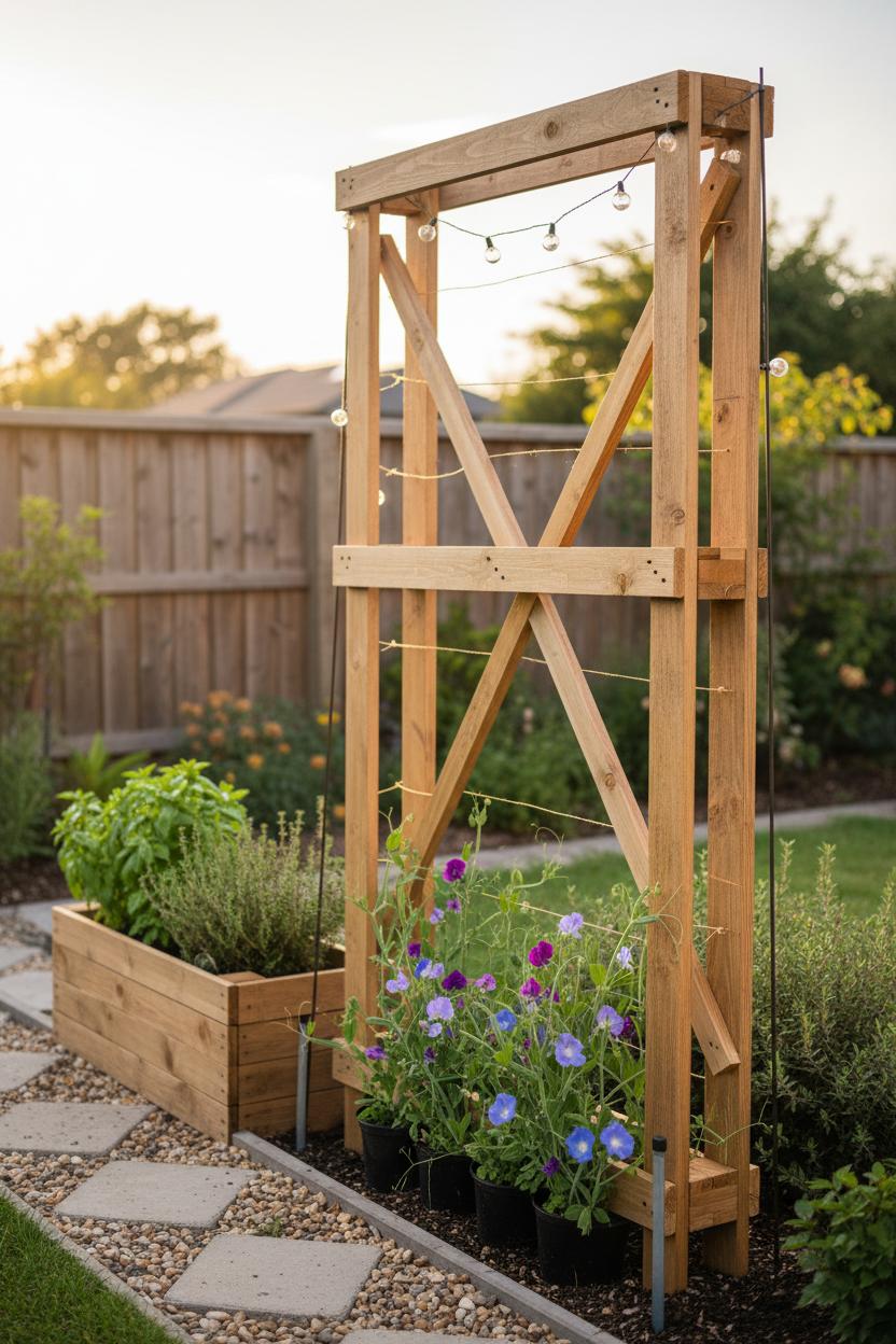 Give your vines a vertical stage with an upcycled trellis that looks boutique but costs next to nothing. Start by sourcing pallet wood (look for the HT stamp, which means heat-treated and garden-safe), then pry the boards apart and sand the edges smooth. Cut a few slats into long rails and shorter crosspieces, and dry-fit a simple crisscross pattern on the lawn until it feels airy and balanced. Pre-drill and screw the joints together—this is where a basic garden tools set with a hand saw, clamps, and a drill earns its keep—then add a couple of angled feet or metal stakes so the frame can slip 6–8 inches into the soil. If you’re low on digging space, fasten the trellis to a narrow planter box or even the back of a pallet planter for instant height on a patio wall. For renters, lean the frame against a fence with rubber feet and secure with zip ties; it’s sturdy, removable, and friendly to small-space backyard projects.