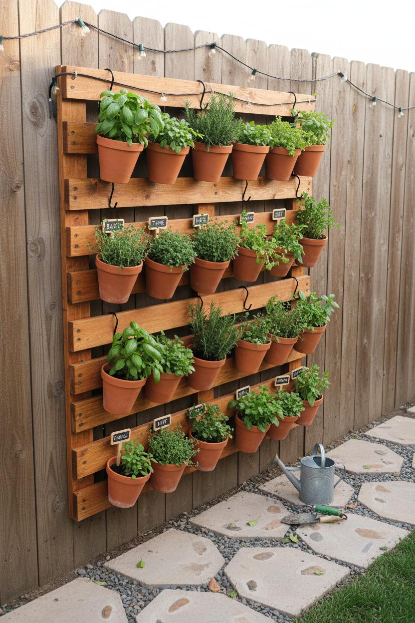 Once your herbs are in, treat the whole display like functional outdoor decor. A warm wood stain or a pop of paint makes those greens glow, and a strand of solar string lights draped along the top rail turns evening harvests into a little ritual. If your fence is a trek from the back door, pour a few pavers using a stepping stone mold to create a charming path right to your mini kitchen garden. For low-maintenance watering, add a slim drip line, or tuck in recycled bottle spikes for slow-release moisture—perfect for weekend getaways. Keep heavier planters at the lower levels and lighter pots up high so the weight stays balanced, and space the rows to give each herb room to breathe. This project checks every box for weekend-friendly backyard projects: budget-conscious, customizable, and incredibly satisfying. Whether you craft a tiered pallet planter from scratch or simply hang a trio of matching herb planter boxes, your fence becomes a fragrant vertical wall that invites daily snips and easy dinners, proving that even the smallest corners can feel lush, stylish, and totally you.
