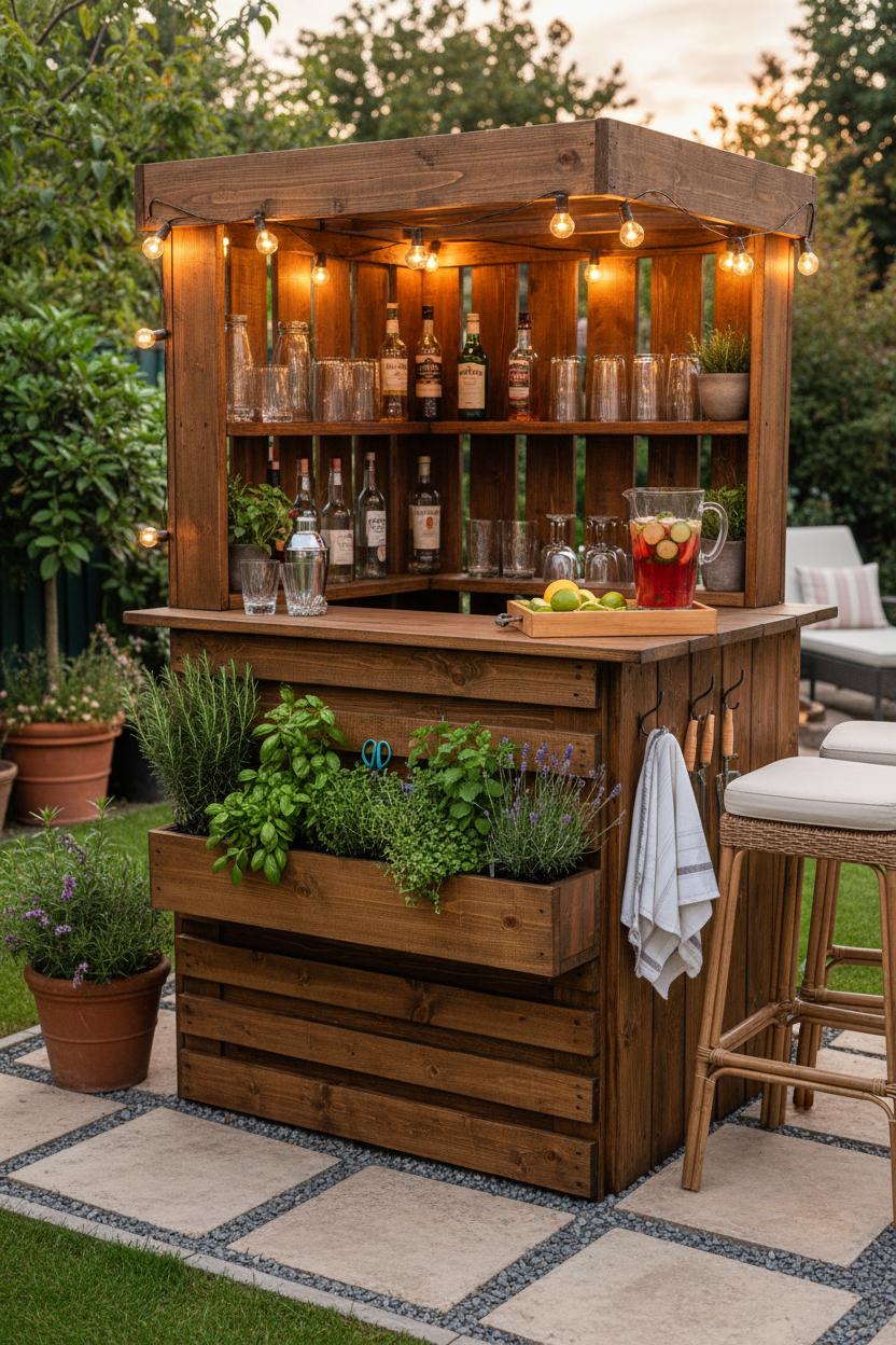 Turn a quiet corner of the yard into the life of the party with a compact pallet wood bar and planter combo that pulls double duty as both serving station and lush green accent. It’s one of those garden diy ideas that looks boutique, but is totally doable on a weekend. Start by reclaiming a couple of sturdy pallets, prying the boards apart, and sanding them smooth; the character of pallet wood brings instant warmth to your outdoor decor. Build a narrow cabinet-style base about waist height, with a flat top for mixing and a couple of shelves inside for bottles and tumblers. On the front, frame a shallow box that runs the length of the bar—this is your built-in pallet planter. Line it with landscape fabric, drill drainage holes, and add a layer of gravel before soil. A swipe of exterior stain and sealant ties it together, and a few hooks on the side hold towels and a small garden tools set for easy potting and pruning.