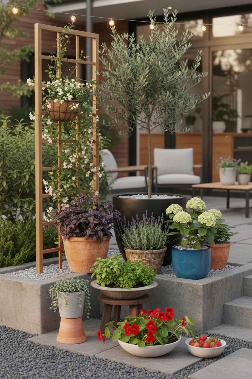 Layering is magic for small garden ideas because it stretches vertical space. Create tiers with sturdy plant stands, overturned pots, or even a low raised garden bed as a stage for your collection. Tuck a vertical trellis behind the grouping and let a jasmine or black-eyed Susan vine climb to frame the scene and scent the air. If your style leans kitchen-garden-chic, brighten the mix with edible moments: a potted Meyer lemon, a fountain of basil and parsley, strawberries spilling from a wide bowl. Group in odd numbers, vary pot diameters, and repeat one color or material to keep things cohesive. The goal is a plush, layered look that reads intentional from the street and intimate up close—like a mini backyard makeover without the heavy lift.