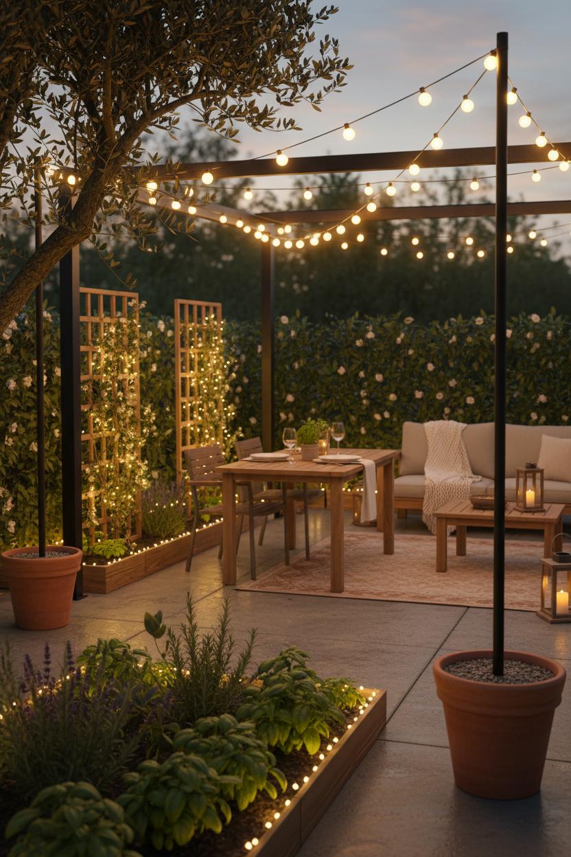 When the sun slips behind the fence and the air settles, that’s your cue to switch on the glow. A canopy of outdoor string lights instantly turns a simple patio into a cozy bistro, casting that warm, flattering shimmer that makes everything—from herbs in planter pots to the texture of your pavers—feel intentional. Think of them as the jewelry of your backyard: drape strands in a zigzag over a dining table, swag them from a pergola to a tree branch, or outline a fence line for soft, ambient edges. If you’re hunting for small garden ideas, use light to draw the eye upward: clip strands to a vertical trellis so climbers like jasmine shimmer at night, or run a single line across a narrow balcony to create height and drama. Even container gardening gets a glow-up when you wind micro lights around a cluster of pots or frame a raised garden bed with a delicate halo.