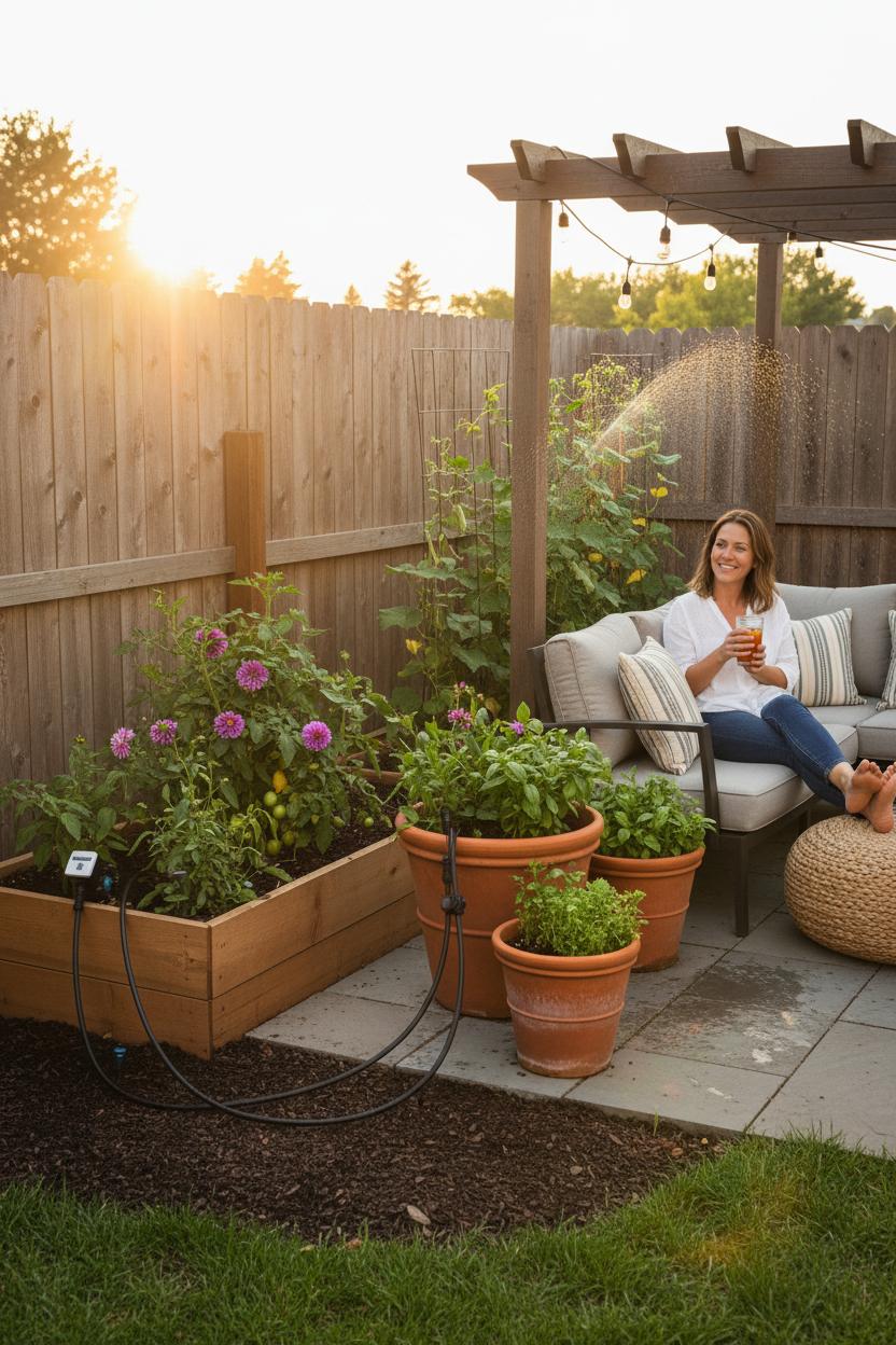 Setting it up is simpler than it sounds. Connect the main line to your outdoor faucet, then weave it around borders, tuck it under mulch, and branch it toward planter pots, the raised garden bed, and up a vertical trellis to pamper climbers like cucumbers or jasmine. Pop in adjustable drippers near each plant’s root zone—more for thirsty tomatoes, less for lavender—and add micro-sprayers where you want a soft, even mist over greens. A battery timer handles dawn and dusk cycles, so moisture sinks in before sun or wind can steal it away. The result is a clean, streamlined system that disappears into the design while quietly doing the heavy lifting. Come evening, flip on the outdoor string lights, breathe in the scent of wet soil, and admire a space that cares for itself—proof that a few clever tweaks can turn routine chores into time for lingering, lounging, and dreaming up your next round of garden inspiration.