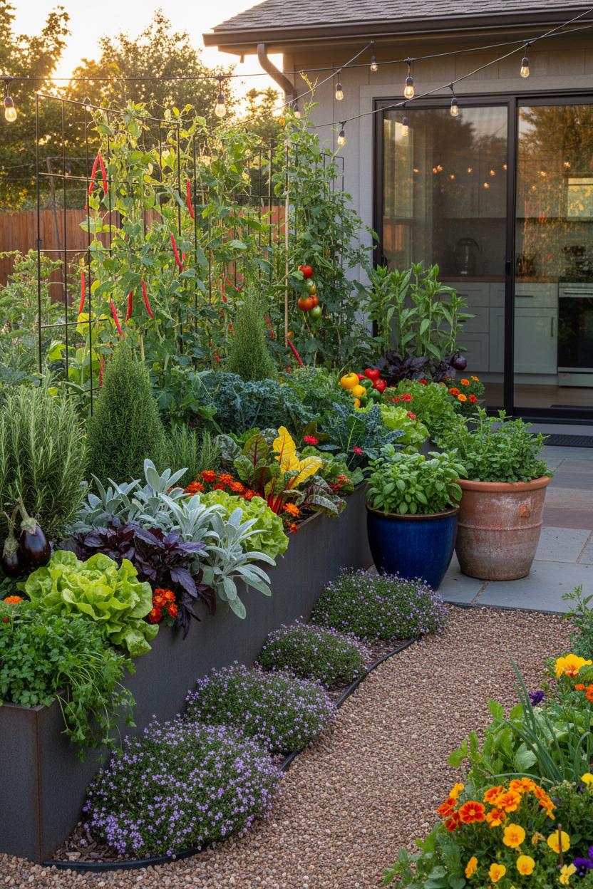 If you’ve ever wished your veggie patch looked as curated as your living room, let this be your garden inspiration: style edibles the way you’d arrange art. Picture soft mounds of thyme edging a path, rosemary pruned into fragrant domes, and silver sage catching the light beside glossy eggplant. A streamlined raised garden bed in cedar or steel reads like a statement piece, framing swaths of butter lettuce as lush groundcover with rainbow chard for a hit of jewel-toned drama. Tuck in chartreuse lemon balm, dusky purple basil, and marigolds to stitch the palette together, and you’ve got edible elegance that feels tailor-made for modern landscaping. Think in layers—tall tomatoes or okra in the back, midsize peppers and kale in the middle, herbs spilling at the front—and repeat colors and leaf shapes for a cohesive, designer look that’s as harvest-friendly as it is beautiful.