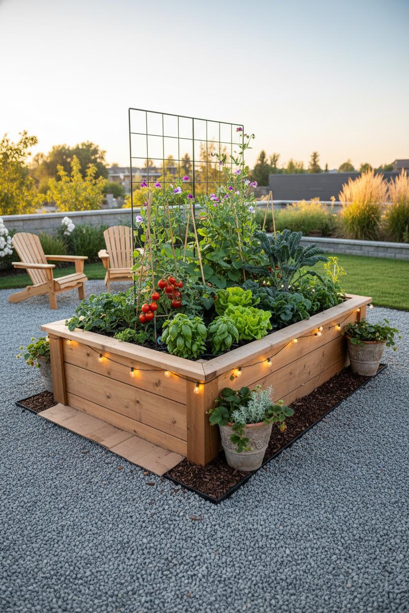 Style-wise, a raised garden bed reads both cozy and clean, a natural partner to modern landscaping cues. Add a vertical trellis at the back for beans, cucumbers, or sweet peas and you’ve instantly layered in height and romance. Tuck a few matching planter pots at the corners for herbs and edible flowers, and let container gardening spill over with strawberries or trailing thyme. At dusk, weave outdoor string lights along the frame for a soft glow that makes harvesting feel like a little celebration. Mix textures—brushed metal or cedar boards, pea gravel paths, fluffy greens—and repeat materials so everything looks curated, not chaotic.