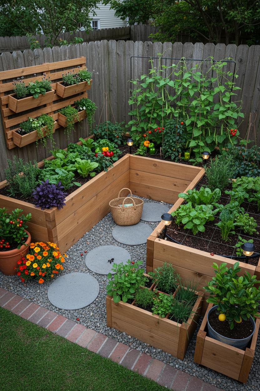 Plant companions like a bouquet for both beauty and function. Edge your raised garden bed with basil, calendula, or nasturtiums to lure pollinators and keep pests guessing, and place a compact herb planter kit near the bed for snip-and-sauté convenience. When you need overflow, treat the corners with container gardening—terra-cotta pots of dwarf tomatoes, a galvanized tub of chard, or a citrus in a rolling planter—to soften edges and add color. For easy care, thread a drip irrigation kit under mulch so soil stays evenly moist without splashing leaves, and dot the border with warm solar garden lights to outline the beds and stretch your evening garden strolls. Finish the look with pea gravel, brick, or cedar edging to tie the setup into your backyard landscaping, and choose cedar or metal for the beds to keep lines clean and modern. Among all the house garden ideas out there, this layout delivers a big return in tiny quarters: fast morning harvests, vertical layers of greens and vines, and a fresh, fragrant pocket of green you’ll visit every day.
