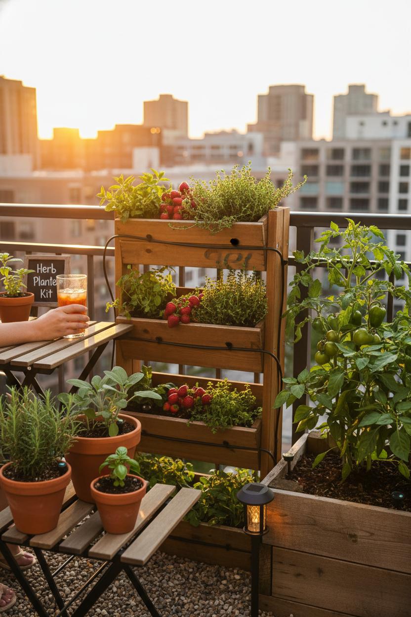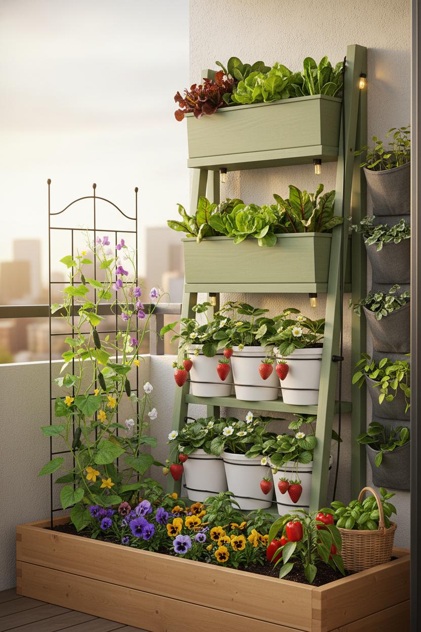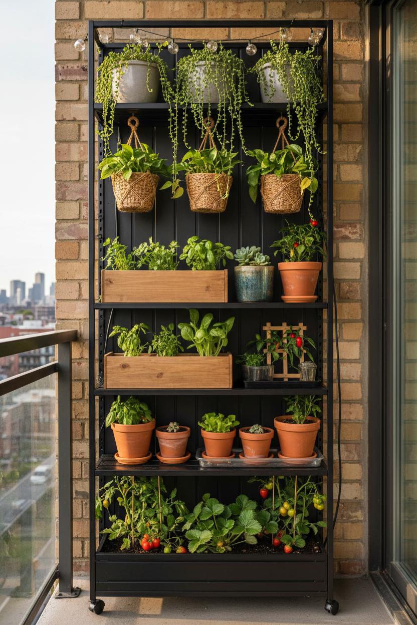 When floor space is precious, you don’t need to edit your plant dreams—just stack them. Think modular racks that climb like chic little green skyscrapers, turning a bare balcony, stoop, or sunny kitchen wall into a layered oasis where vertical gardening and container gardening share the spotlight. A narrow shelving unit, ladder shelf, or wall-mounted rail system becomes your canvas: tuck compact pots on lower tiers, hang vertical planters at eye level, and let a couple of trailing beauties spill from the top for that lush, cascading moment. For edible greens in micro spaces, anchor the base with a slim raised garden bed on casters, then layer upward with an herb planter kit so cilantro, basil, and mint perfume the air while cherry tomatoes and strawberries reach for the sun. This is the kind of small garden design that feels custom and flexible, one of those house garden ideas that makes even a tiny patio look like thoughtful backyard landscaping in miniature.