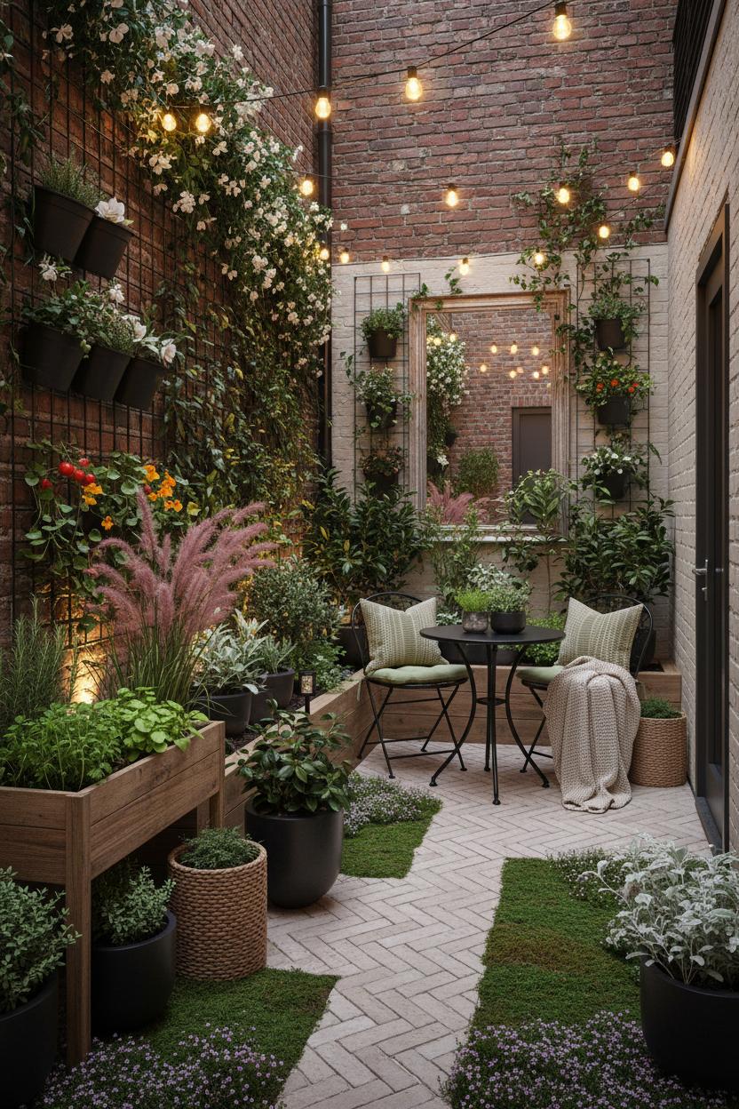 Finally, paint with light. String soft cafe strands overhead to emphasize height, then dot solar garden lights along the path and at the base of climbers to silhouette leaves against the wall. A mirror or pale limewash on a boundary can bounce both light and greenery around, doubling the sense of space. Leave room for a small bistro set or a bench nestled into the planting, and layer a throw or outdoor cushions to mirror the textures in your pots. With a few smart choices—vertical gardening up top, container gardening in the middle, and tactile ground covers below—your courtyard becomes a layered jewel box, proof that the best backyard landscaping often happens in the smallest spaces.