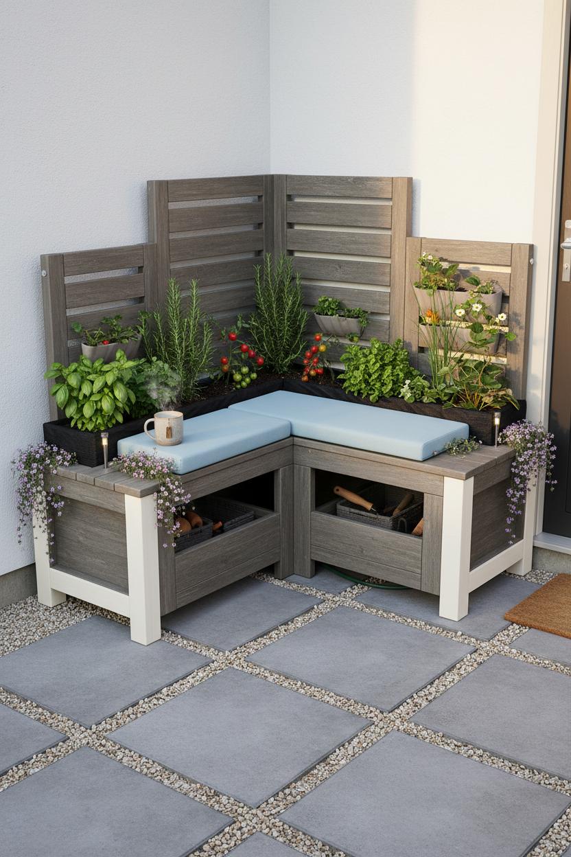 Imagine a cozy bench that also grows your favorite plants—multi-functional seating with built-in planters is one of those house garden ideas that instantly elevates a tight patio, balcony, or front stoop. Think of an L-shaped corner bench hugging a wall, with planter boxes forming the arms and back so you can perch a mug on one side and snip basil on the other. It’s a small garden design win because every inch works twice: you get lounging space and lush greenery without sacrificing precious square footage. Treat the planters like sleek container gardening troughs, lining them with fabric for airflow and adding lightweight soil so roots stay happy. Herbs thrive by a sunny seat—try an herb planter kit for easy starts—then tuck in edible flowers or trailing strawberries for a pretty, practical edge. If privacy is a goal, extend the backrest upward with slatted screens or vertical planters to lean into vertical gardening; it softens hard lines and makes your sitting area feel like a leafy nook. Hide a compact drip irrigation kit beneath the seat and let a simple timer handle watering while you enjoy the shade.