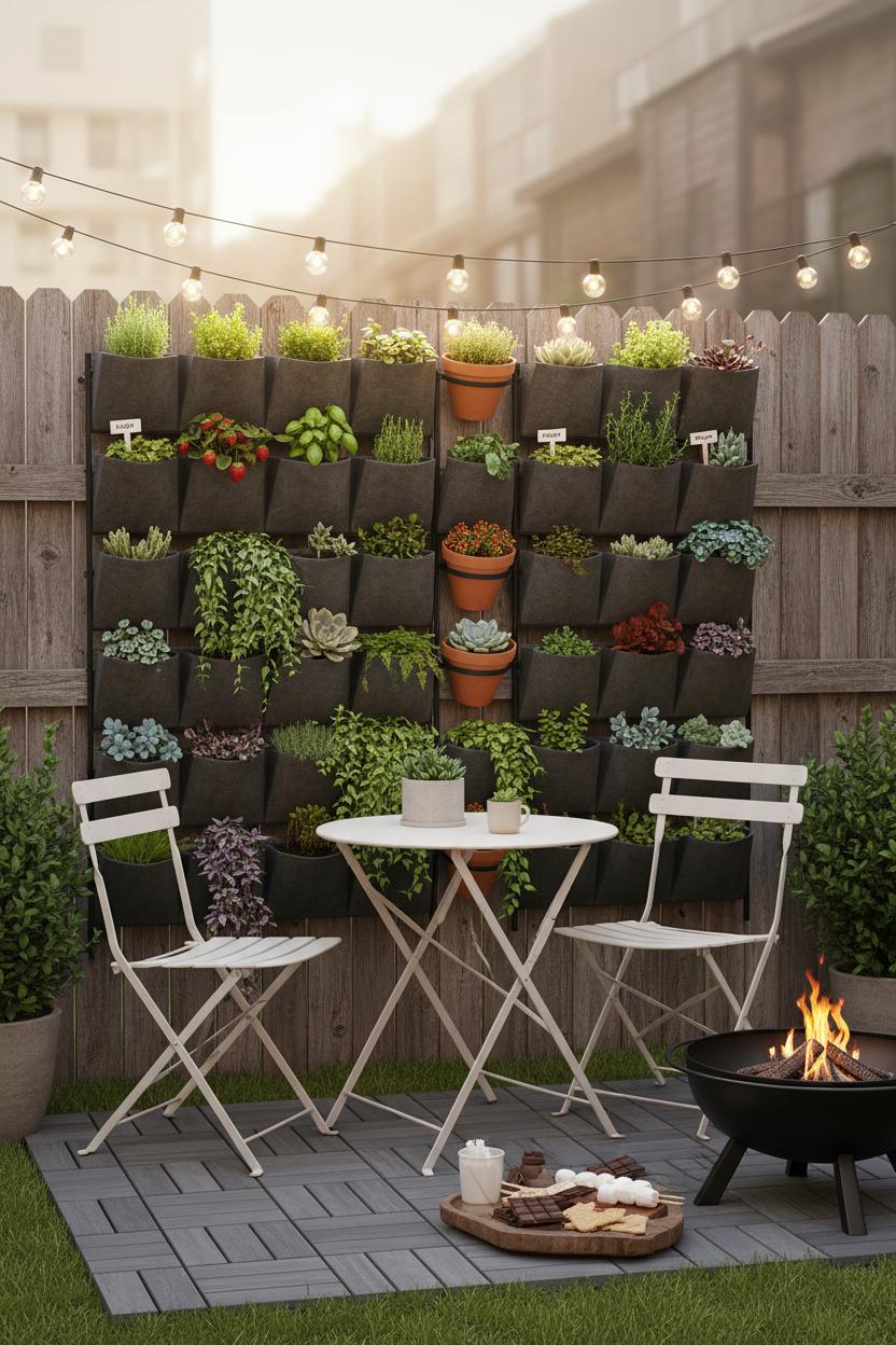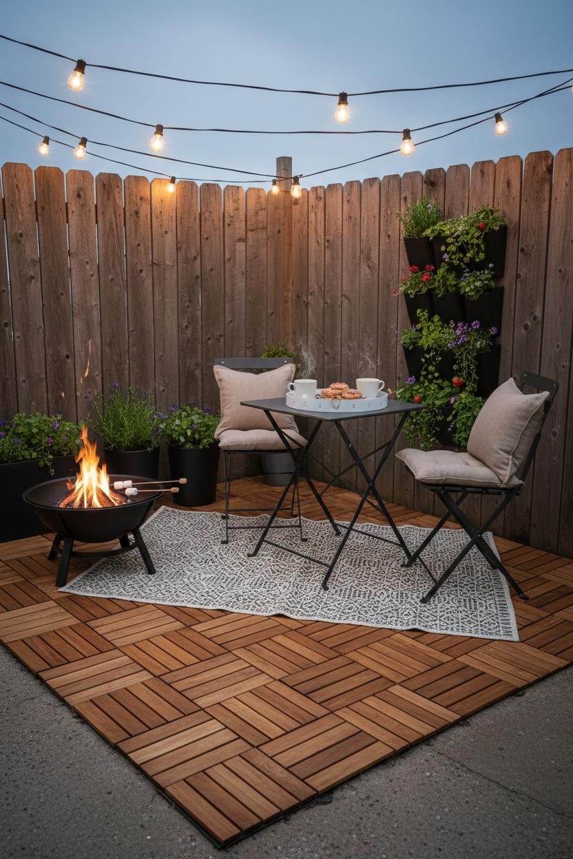 Once the “floor” is in, layer in little luxuries that make the space sing. A folding bistro set tucks away when you need floor space for yoga or guests, and outdoor string lights cast that café glow that makes even weeknights feel special. If local rules allow, a compact fire pit brings marshmallow moments to a postage-stamp patio. To maximize every inch, go vertical: a slim vertical planter turns a blank fence into a living vertical garden for herbs, strawberries, or trailing flowers—functional and so pretty. Group two or three planters at different heights to add depth, and echo the tile tones with planters in similar woods or matte black for contrast. Finish with a washable outdoor rug to soften underfoot, a tray for easy al fresco coffee service, and a couple of weather-friendly cushions. The beauty of this mini patio makeover is how it elevates small yard landscaping without heavy digging or big budgets—just smart layers and texture. In a day, your small deck tiles define zones, your lighting sets the mood, and your greenery frames the scene, transforming a once-forgotten corner into the most loved spot in your home.
