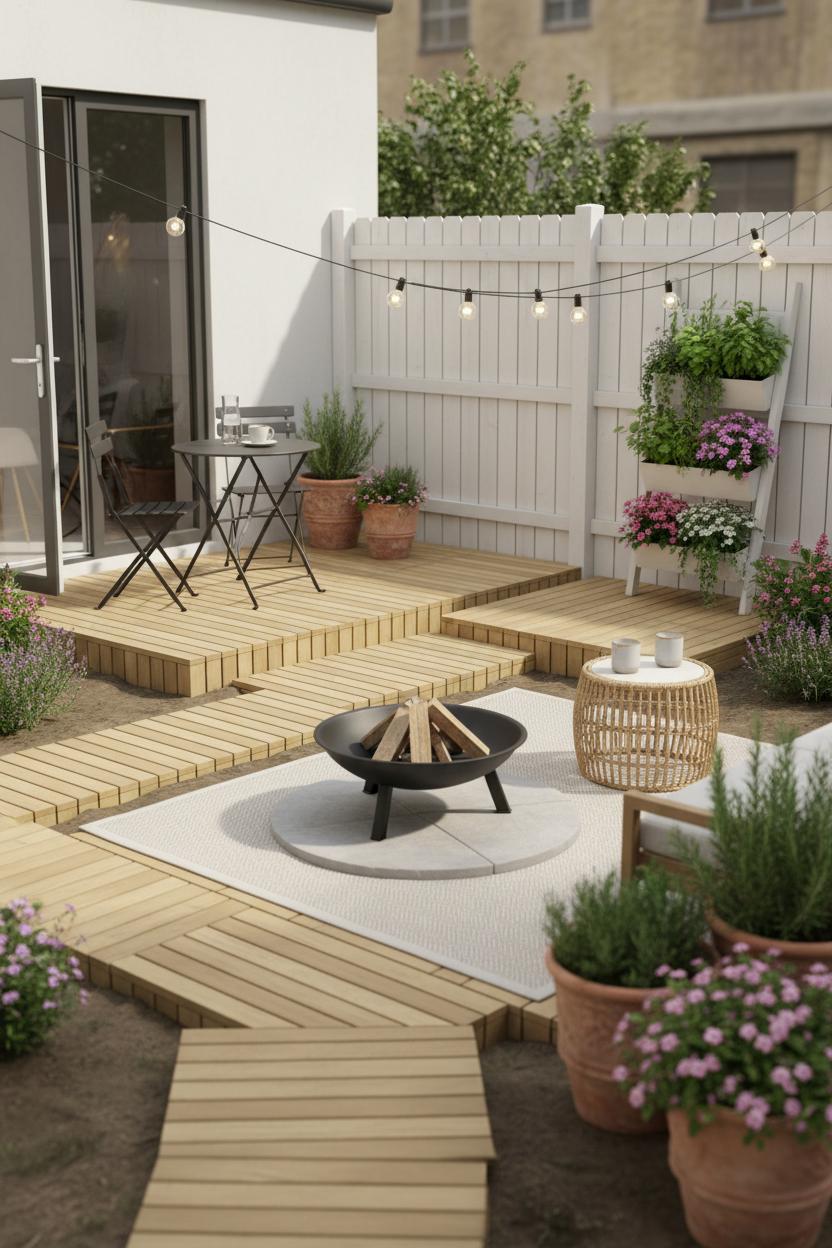 Once your floor plan is set, go up, not out. A slim vertical garden or a ladder-style vertical planter tucked along a fence frames your zones with fresh herbs and trailing blooms while preserving precious circulation. Drape outdoor string lights in a gentle swoop between the “dining” and “lounging” pads so the whole area feels connected after dark, and, if you have the clearance, center a compact fire pit on a heat-safe platform for a cozy focal point that doesn’t swallow the yard. For small yard landscaping, repeat materials and colors across zones—matching wood tones on the tiles, similar planters at the edges—so everything feels cohesive rather than cramped. Keep pathways a foot or two wide and uninterrupted, and align the tile edges with your sightlines from the door so your brain reads more “inviting retreat” than “tight squeeze.” The best part? These zones are flexible. Swap the folding bistro set for a chaise in summer, slide in a planter bench in spring, or move a few tiles to widen the lounge when friends come over. With a few smart layers and some portable pieces, those humble tiles become the secret to flow, function, and a backyard that lives far larger than its footprint.