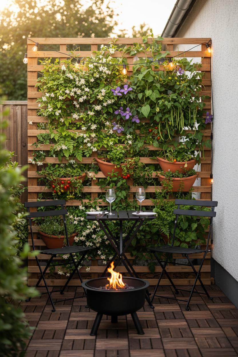 Start with placement: anchor a trellis along a property line, behind a seating nook, or as a leafy backdrop for a micro dining zone. If the surface is rough, click together small deck tiles to define a level perch, then mount a sturdy vertical planter and weave in your climbers. A simple drip line or self-watering inserts keeps a vertical garden low-maintenance, and lightweight potting mix protects your fence. For a quick patio makeover, tuck in a folding bistro set, drape outdoor string lights from the trellis to a wall hook for evening sparkle, and, where codes allow, center a compact fire pit for cozy shoulder-season hangs. Choose evergreen vines for year-round cover, layer in seasonal color, and don’t forget edibles—mint, thyme, and cherry tomatoes turn your wall into a pantry. The best part? Maintenance happens at eye level, so pruning, harvesting, and refreshing soil are easy and rewarding—proof that smart, vertical thinking can transform even the slimmest small outdoor space into a private, garden-wrapped escape.