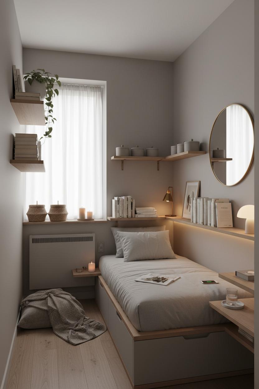 For even more space saving tips, let your shelves do double duty. Add a low shelf beside the bed to hold a charging tray and water glass, then mirror the look with a second ledge higher up for a soft-glow lamp—instant symmetry without bulky furniture. Balance the vertical lines with a large wall mirror to bounce light around and visually widen the room, and keep the overall palette calm for a minimalist bedroom feel. If you’re mapping out broader storage solutions, pair those wall mounted shelves with a platform bed with drawers or slide under bed storage bins out of sight for off-season clothes and spare linens. Corral small items in lidded boxes on the lower shelves, reserve the top for decorative moments, and rotate displays seasonally so the room always feels fresh. A tiny strip light tucked beneath a shelf adds gentle nighttime glow, while concealed cord clips keep cables tidy. With a few thoughtful choices, these simple shelves become the quiet heroes that clear your floor, elevate your style, and make every inch work a little harder.