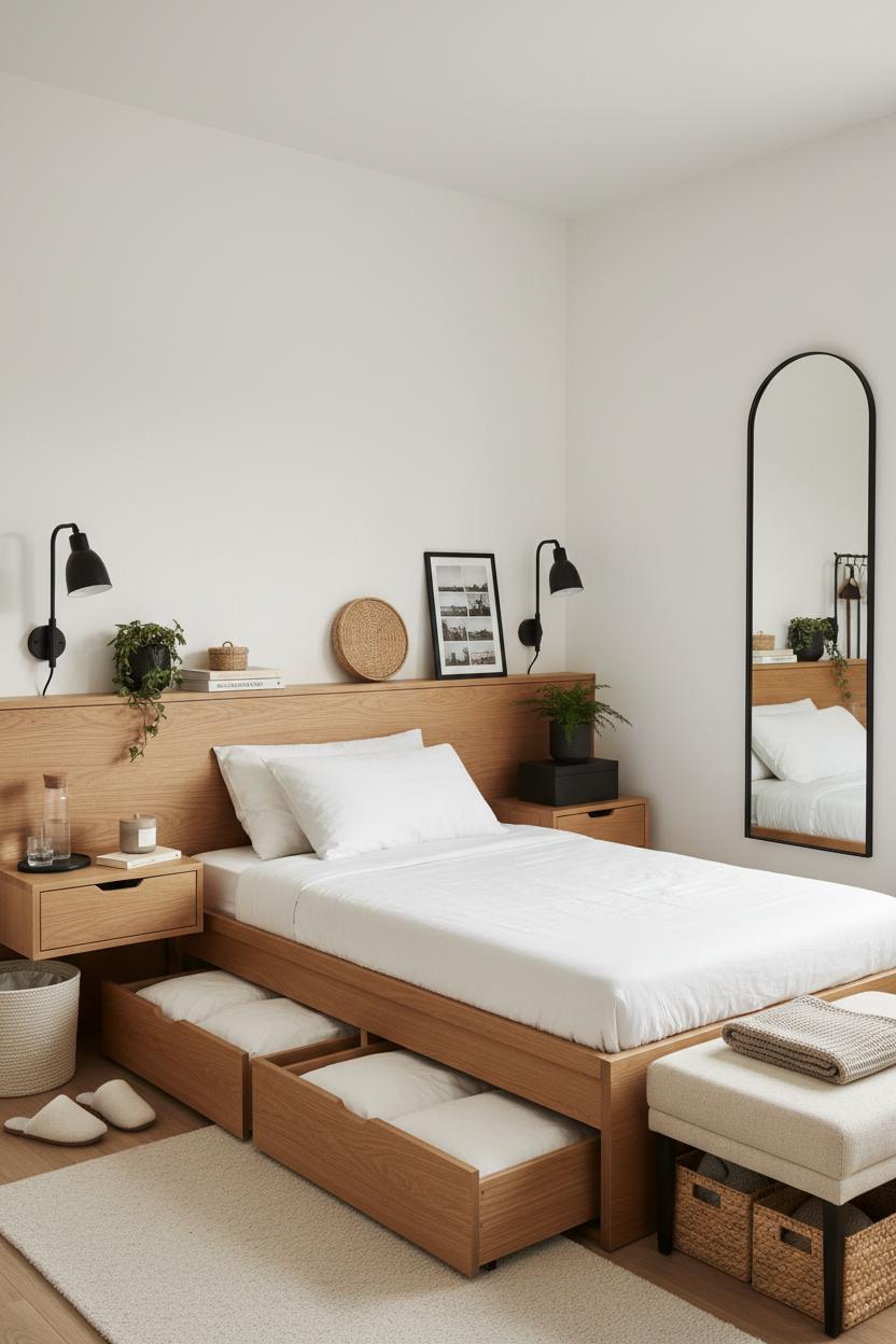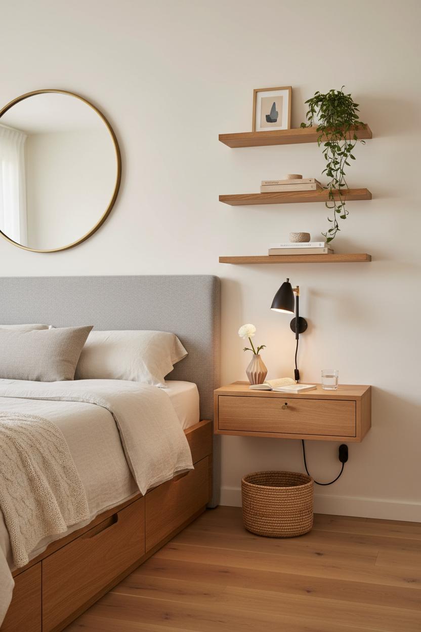 Focus your energy around the bed, the biggest zone to optimize. A platform bed with drawers turns dead space into hidden linen and sweater storage, while slim under bed storage bins slide out like secret compartments for off-season clothing. Skip bulky side tables and try a floating nightstand with a drawer; it frees floor space and makes room for a petite hamper or slippers underneath. If you’re short on closet space, add wall mounted shelves above the headboard as a shallow ledge for books, a small plant, and a woven box—just keep the line clean and evenly spaced for a custom look. Matching lamps eat up valuable tabletop real estate, so mount sconces or clip-on reading lights and keep that surface clear for a single book and a water carafe. Little space saving tips like swapping a framed photo for a digital frame (hello rotating gallery) or choosing a lidded candle that doubles as a trinket jar add up fast.