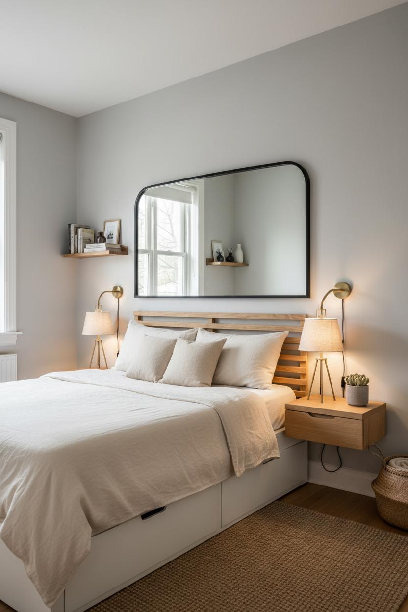 To supercharge the illusion, pair your mirror with smart storage solutions that keep the floor clear. A platform bed with drawers or sleek under bed storage bins hide off-season clothing, while wall mounted shelves and a floating nightstand free up precious square footage and keep sightlines clean. These space saving tips let the mirror work harder, because clutter isn’t competing with that lovely reflection. Finish with soft, layered lighting that the mirror can amplify—a petite sconce or two, a glowing table lamp—and you’ll have a room that looks and feels twice its size. Among all the small bedroom ideas to try this weekend, hanging a thoughtfully placed large wall mirror might be the most transformative.