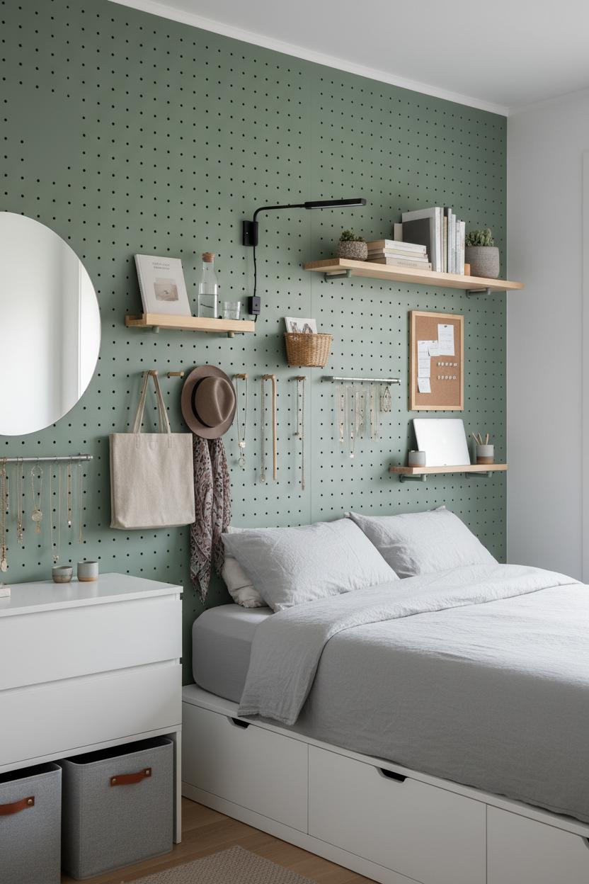 Round things out with wall mounted shelves higher up for display and books, and hang a large wall mirror nearby to bounce light and make your tiny bedroom decor feel spacious and calm. Keep the palette restrained—wood pegs, woven baskets, linen pouches—so the whole system reads airy rather than busy. The beauty of pegboards and hooks is that they’re flexible, affordable, and visually light, letting your room breathe while quietly multiplying its function. Vertical zones = less clutter, more living.