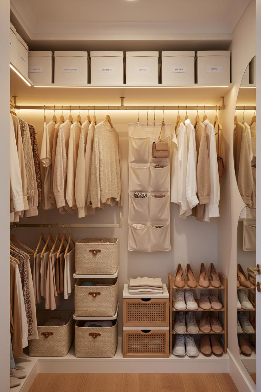 Style it like your outfits deserve it. Choose one hanger color for a calm, minimalist bedroom vibe and coordinate your bins—woven textures or soft canvas—to echo the soft goods in the rest of your room. If your closet is shallow (or nonexistent), build a chic “open closet” with wall mounted shelves up top and a single rail below, then tuck bulkier items into under bed storage bins or opt for a platform bed with drawers to keep sweaters, linens, and extra pillows out of sight. A floating nightstand frees up floor real estate for a laundry hamper, while a large wall mirror on the back of the closet door (or leaning nearby) bounces light and doubles the visual square footage—tiny bedroom decor magic. Edit ruthlessly, measure before buying, and mix modular pieces that can grow with you: add a second rod when your wardrobe expands, slide in a narrow drawer unit for folded tees, and use dividers to keep stacks neat. With a few thoughtful tweaks, your closet becomes the anchor of your best storage solutions, proof that even the smallest corners can feel generous when everything has a beautiful, intentional place.