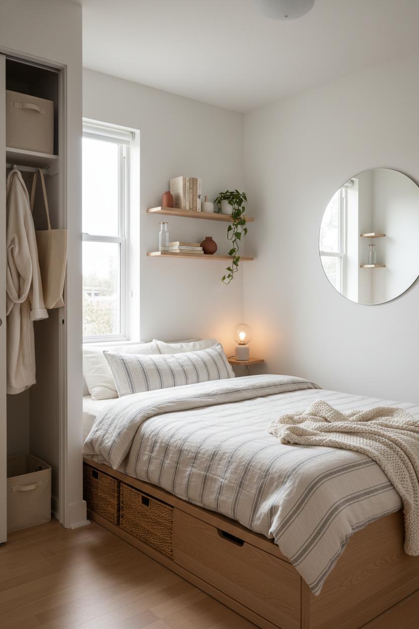 Craving more room in less square footage? Discover 12 smart small bedroom ideas packed with space saving tips, tiny bedroom decor inspiration, and clever storage solutions. From under bed storage bins and a platform bed with drawers to wall mounted shelves, a floating nightstand, and a large wall mirror, we’ll show you how to style a chic minimalist bedroom that feels airy, organized, and totally you. Click through for easy swaps, renter-friendly hacks, and budget finds to maximize every inch.