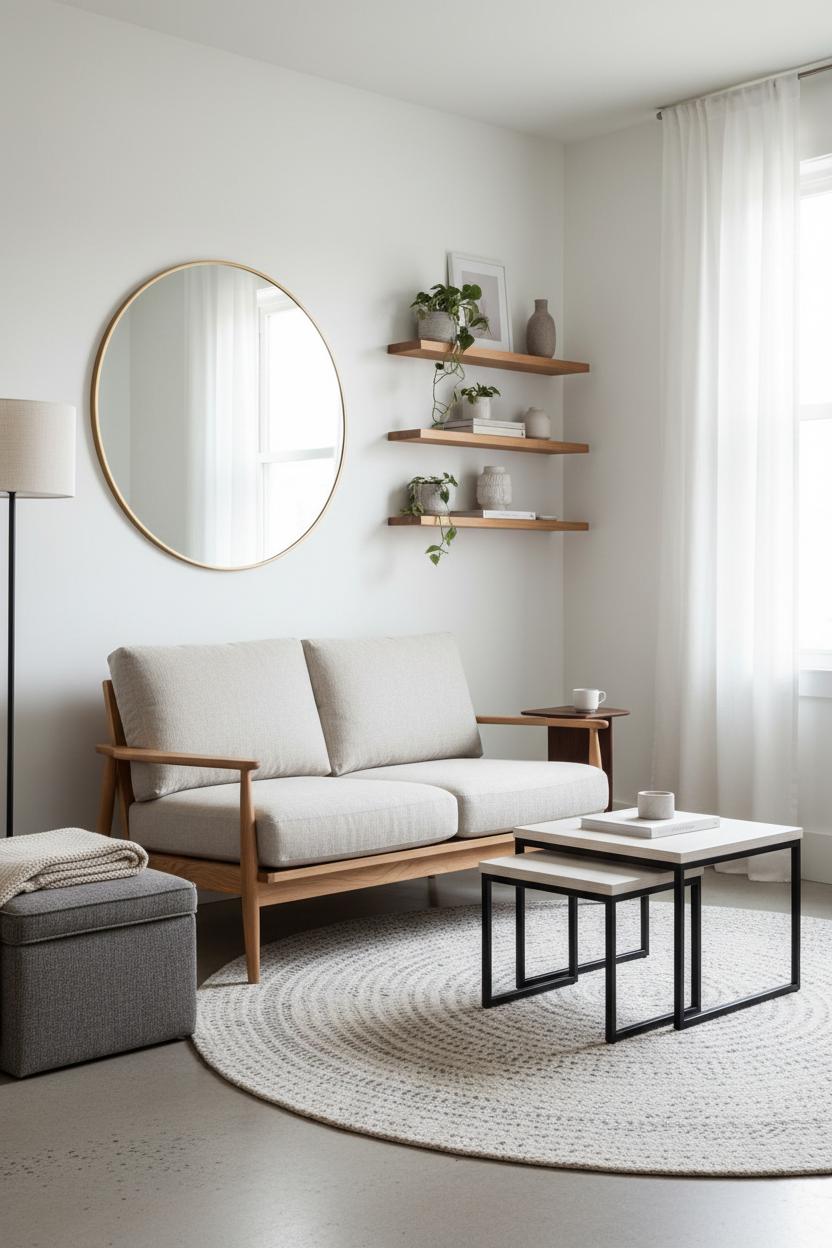 Next, layer in space saving furniture that pulls double duty. A nesting coffee table gives you options: spread the tables out when friends drop by, then tuck them together for an instant footprint shrink. Swap bulky trunks for a storage ottoman to hide blankets, remotes, or board games while offering extra seating at a moment’s notice. Mount the TV and use wall shelves instead of a deep console to draw the eye up and free the floor. Keep silhouettes slim and legs visible—open bases feel lighter and help your small living room decor read tailored rather than cramped. In a minimalist living room, fewer pieces with better proportions beat a crowd of tiny accents every time.