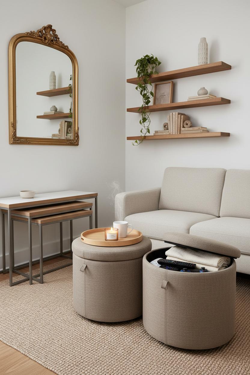 Placement matters just as much as style. Center your ottoman like a coffee table, then give yourself a comfortable walkway around the sofa. If you crave more table surface, a nesting coffee table can slide out for movie night and tuck away the rest of the week, reinforcing the space saving furniture theme without cluttering the floor. Layer in wall shelves above to display books and a plant while keeping surfaces clear, and hang a large wall mirror to bounce light and make the whole room feel airier. In narrow apartments, two petite ottomans side by side can split apart when you need extra seats, or scoot under a console when not in use—smart apartment decorating that adapts with you.