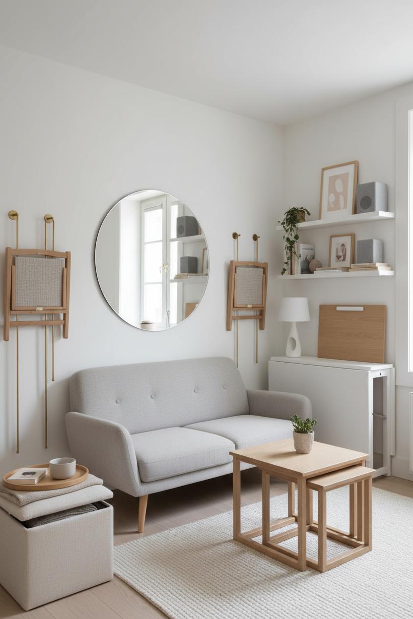 When you’re tight on square footage, the smartest tiny living room ideas revolve around pieces that do more than one job—and ideally fold away when you’re done. Think of your furniture as friendly transformers: a drop-leaf console that opens into a dining table for two, a folding wall-mounted desk that tucks up after work, or a nesting coffee table that separates for movie-night snacks and slides back together to free the floor. A storage ottoman can moonlight as extra seating, a footrest, or a makeshift side table with a pretty tray on top, while stashing throws and board games inside. If you love hosting, keep a pair of slim, folding accent chairs hung on hooks or slipped behind a curtain; they appear when company arrives and vanish just as easily. This kind of space saving furniture instantly stretches what your room can do without crowding it.