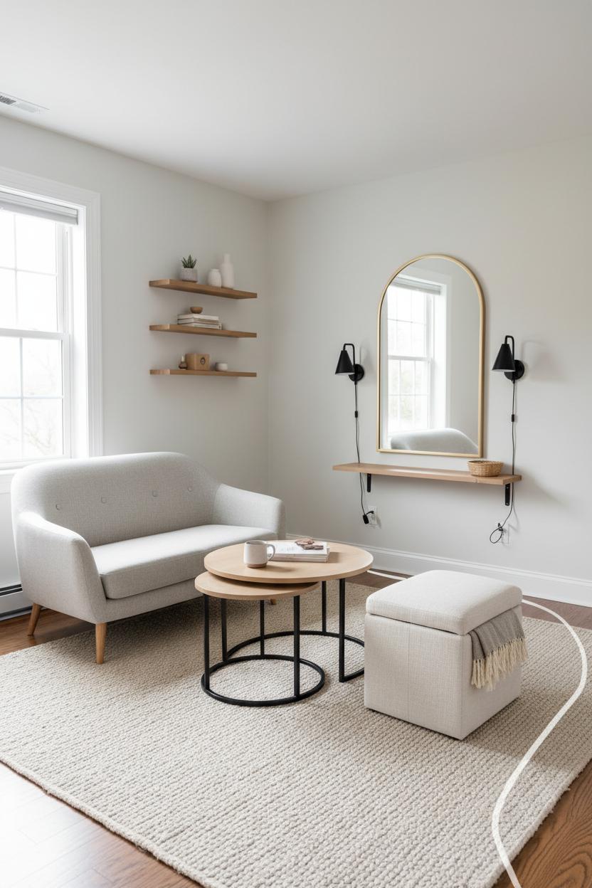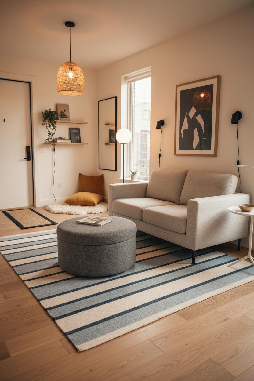 Furniture choices should reinforce these zones. A storage ottoman can live on the sofa rug, acting as coffee table, footrest, and extra seat in one tidy package. Keep a pair if you entertain; they split effortlessly when you reconfigure. Wall shelves mounted above the reading rug keep clutter off the floor and spotlight your favorite books, while a compact, clean-lined small loveseat holds the main area without blocking pathways. These space saving furniture moves are perfect for apartment decorating, letting you flex layouts for everyday living and guests. With rugs as anchors and layered lighting as your guide, even the tiniest footprint feels intentional, warm, and beautifully pulled together.