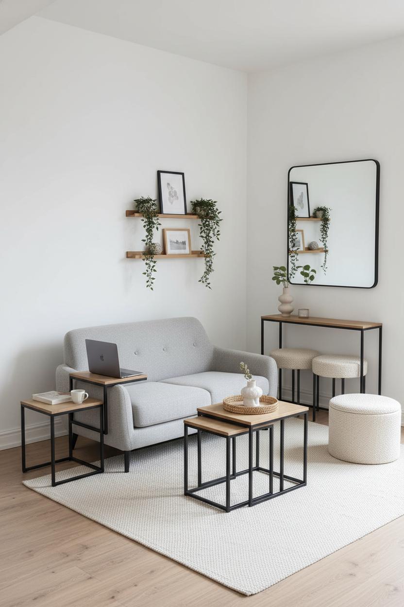 Keep the palette calm and the clutter corralled for that minimalist living room vibe—soft neutrals, a few tactile layers, and hidden storage wherever possible. Corral remotes in a lidded box, hide throws in the storage ottoman, and let the nesting coffee table take center stage only when you need it. Add personality with a curated mini-gallery on wall shelves and a single sculptural lamp, then let negative space do the heavy lifting. The result is a room that adapts to your day—work zone at 9, yoga studio at 5, cozy lounge by 8—proving that the right space saving furniture can make even the smallest living room feel generous.