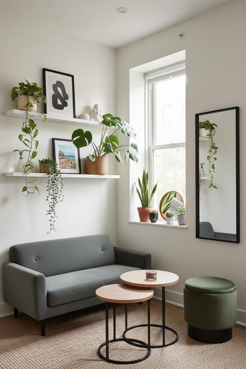 Balance those vertical moments with a few smart, space saving furniture choices at ground level so the whole room breathes. A nesting coffee table tucks together when you need floor space, then fans out for game night or tea with friends. A storage ottoman doubles as extra seating and hides the watering can, potting supplies, or seasonal pillow covers. Across from your shelves, hang a large wall mirror to bounce light back onto your plants and make the room feel twice as open. Keep frames slim and consistent—black, brass, or natural wood—so the greenery remains the star, and repeat planter materials for cohesion. Rotate art with the seasons, snip a pothos vine to propagate in a bud vase, and let your display evolve without adding clutter. With the right wall shelves and a well-styled window sill, you’ll elevate your decor literally and figuratively—proof that even the smallest living room can look lush, collected, and wonderfully spacious.