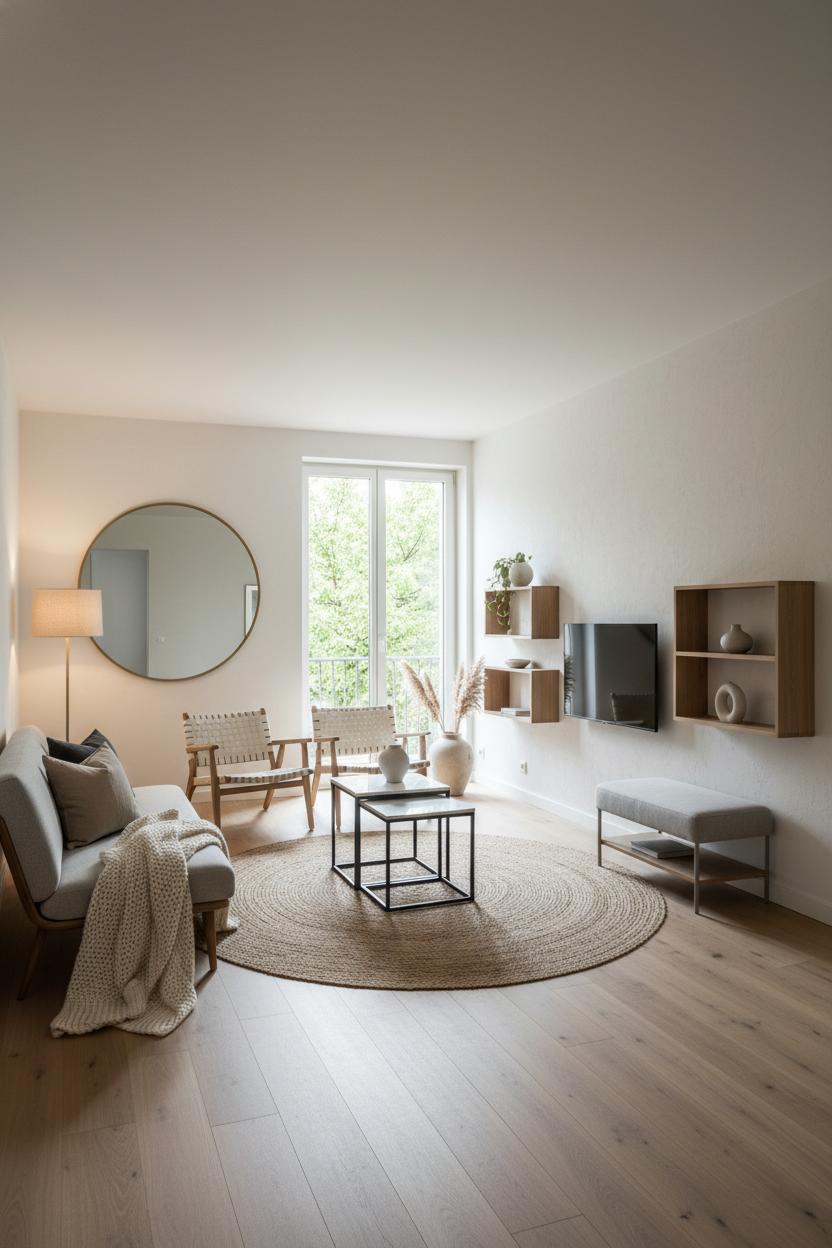 For daily life, let every piece earn its footprint. A storage ottoman doubles as coffee table, extra seat, and blanket hideaway—prime space saving furniture that keeps the path uncluttered. If you’re apartment decorating, map the walkway with painter’s tape before committing; it’s a simple trick that prevents “furniture creep.” Mirrors expand the sense of flow, so hang a large wall mirror opposite a window to bounce light down the corridor you’ve created. Keep side tables slim, lamps wall-mounted if possible, and cords corralled; visual noise can congest a route as quickly as actual objects. Choose small living room decor that’s streamlined and tonal, letting textures do the talking—linen, wood, woven baskets—so the eye glides rather than stops. These tiny living room ideas keep the energy calm and the floor free, all while staying true to a minimalist living room vibe. With a few thoughtful swaps and a focus on clear paths, your space will feel bigger, brighter, and blissfully easy to live in.