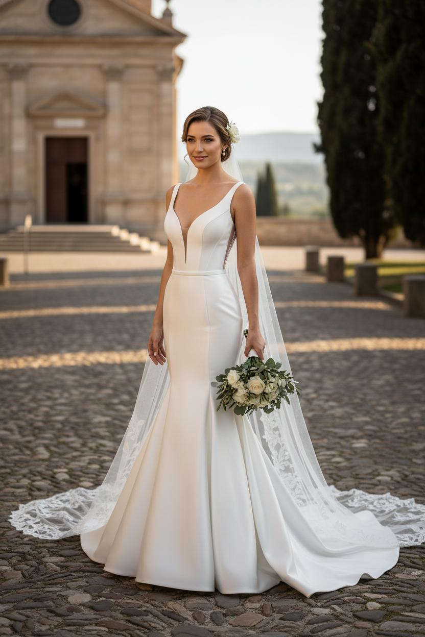 If your heart skips a beat for clean lines and luminous fabric, a satin wedding dress is the modern classic to put on your vision board. In 2025, minimalism is all about intention: buttery charmeuse that drapes like liquid, tailored seams that frame the waist, and necklines—square, cowl, or sleek strapless—that feel chic without trying. A satin bridal gown photographs beautifully, catching light in a soft glow that looks timeless in every setting, from a city rooftop to a candlelit ballroom. If you crave simplicity but still want a “moment,” consider a column silhouette with a sculpted corset, a bias-cut slip that skims rather than hugs, or long, fitted sleeves that balance a daring open back.