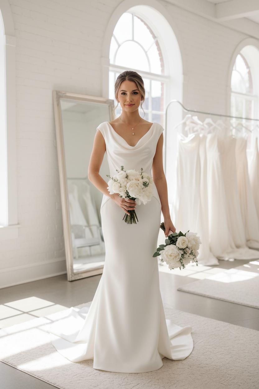 Keep accessories edited and intentional: pearl drops, a sculptural cuff, satin mules, or silk evening gloves for old-Hollywood polish. Ivory and soft champagne are the go-tos, but modern brides are embracing pearlized finishes and ultra-clean white for extra pop in photos. Whether you’re browsing bride dresses for a refined city hall moment or a grand affair, a satin wedding dress offers that elusive blend of ease and elegance—unfussy, impeccably tailored, and unmistakably modern.