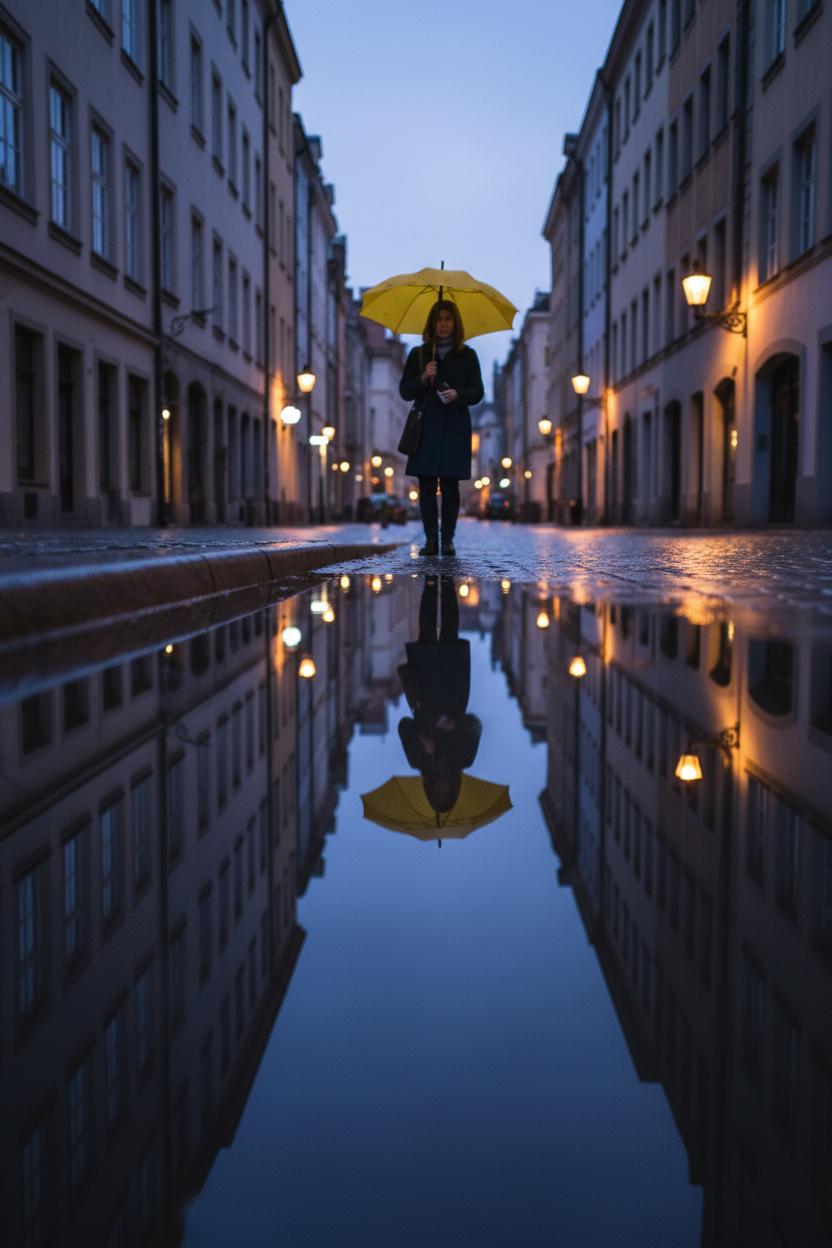 When the rain eases or the street cleaners pass, look down. Puddles turn ordinary corners into tiny lakes that double the drama of a skyline, a street mural, or your own silhouette. For travel photography that feels like poetry, crouch low and compose so the reflection fills half the frame, then tilt until curbs and building lines form a crisp horizon. Tap to focus on the reflection rather than the object above it—this simple switch is a game-changer for beginner photography. Add a pop of color (a scarf, an umbrella, a bright sneaker) and step into the scene for a self-portrait that feels candid and cinematic. If you’re carrying a mirrorless camera, set a higher f-stop for sharper symmetry, and use a lightweight travel tripod for steadiness at blue hour when puddles glow with neon. A comfy camera strap helps you move and kneel safely without juggling gear.