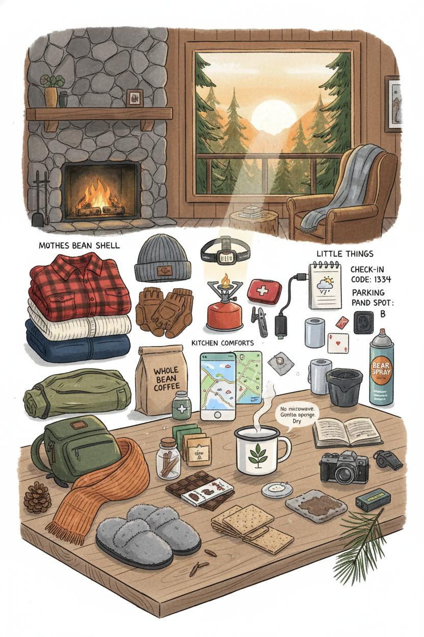Before you roll down the mountain road and back to reality, take a minute to sweep through a practical-but-pretty checklist that matches the vibe of your 3-Day Cozy Cabin Trip Itinerary (Mountain Escape). Clothing first: pack layers you’ll actually wear—think a favorite flannel shirt, thermal base layers, wool socks, and hiking boots already broken in so they don’t steal attention from the trail views. Add a puffer, beanie, and a lightweight rain shell for moody weather. Tuck in fingerless gloves for morning coffee on the deck. These cozy cabin tips pair nicely with your cabin trip itinerary and keep your mountain vacation plan effortless: a soft scarf that doubles as a throw, slippers for creaky floors, and a compact daypack for spontaneous overlooks and golden-hour walks.