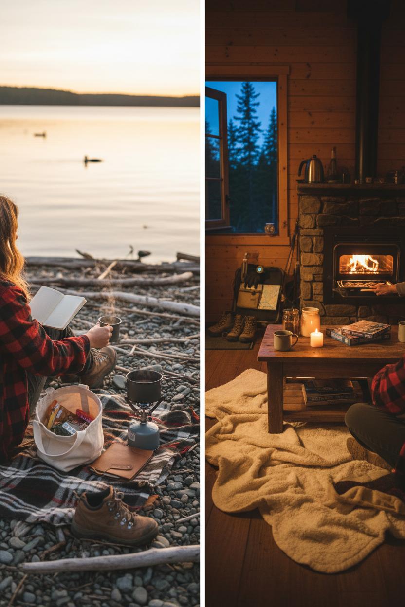 Drop your bags, breathe in the piney air, and wander down to the lake for a slow, simple picnic that sets the tone for the whole cabin trip itinerary. The shore is usually quiet in the afternoon, with glassy water and a soft breeze that ruffles your flannel shirt just enough to make the sunshine feel extra golden. Pack a blanket, a few market snacks, and something warm in an enamel camping mug—apple cider or cocoa are perfect—and if your spot allows it, fire up a compact portable camp stove to simmer a small pot while you watch the ripples. Slip into sturdy hiking boots to explore the driftwood-strewn edges and skip rocks, then settle back to journal, sketch, or just listen to the loons. This little pause is a gentle cornerstone of your weekend cabin getaway and keeps the rest of your mountain vacation plan feeling spacious and unrushed, more slow-living than checklist.