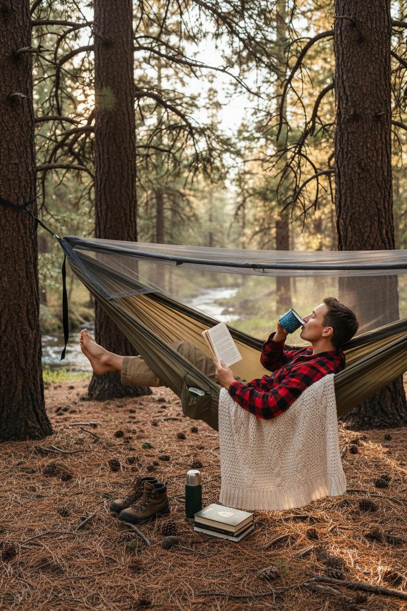 After lunch, lean into the quiet rhythm of the trees and make the hammock your headquarters for a couple of dreamy hours. In this cabin trip itinerary, Day 2’s forest retreat schedule is intentionally slow: sway under the pines with a paperback and a soft throw, slip into your favorite flannel shirt, and sip something warm from an enamel camping mug while the breeze threads through the branches. Kick off your hiking boots and let your toes breathe, but keep them within reach for a lazy wander to the creek. If the sun peeks through, tilt your face up and just listen to the birds; if clouds roll in, zip the hammock’s bug net and nap to the hush of the wind. Cozy cabin tips for hammock time: stash a small speaker for gentle folk tunes, a thermos within arm’s length, and a lightweight blanket for when the shade gets cool.