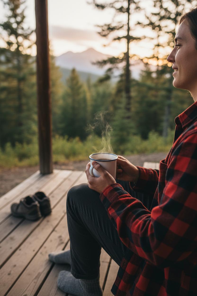 Let the last morning be slow on purpose—wake to the hush of pines, pull on a soft flannel shirt, and shuffle to the porch with an enamel camping mug warming your hands. If the cabin has a kitchenette, sizzle up a simple skillet breakfast; if you brought a portable camp stove and it’s permitted outdoors, fry eggs and toast in the crisp air while the mountains blush awake. This is the moment to savor the hushed rhythm you built into your cabin trip itinerary: a weekend cabin getaway isn’t about rushing to squeeze in one more hike, it’s about lingering. Sit by the window or woodstove and watch steam curl from your cup. Breathe in the cedar, the coffee, the last of the quiet.