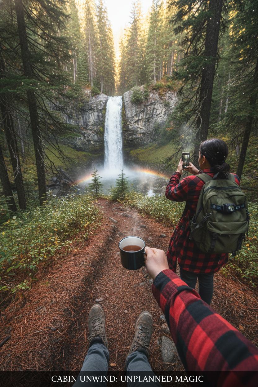 Slip out after a simple cabin lunch for one last dose of wonder: a spur trail to the waterfall you’ve been eyeing on the map. The air cools as the path narrows, pine needles soft under your hiking boots, and the hush of the forest gives way to the steady heartbeat of rushing water. This is the unplanned magic your mountain vacation plan leaves room for—an easy detour folded into your forest retreat schedule. Mist beads on your cheeks when you round the bend; sunlight breaks through evergreens and turns the spray into glitter. Toss a flannel shirt around your waist for the breeze by the pool, clip a headlamp to your daypack just in case the light fades early under the canopy, and linger long enough to feel the week’s noise rinse away. Snap photos, sip a quick drink, listen to the waterfall’s low thunder, and promise yourself you’ll carry this hush back home.