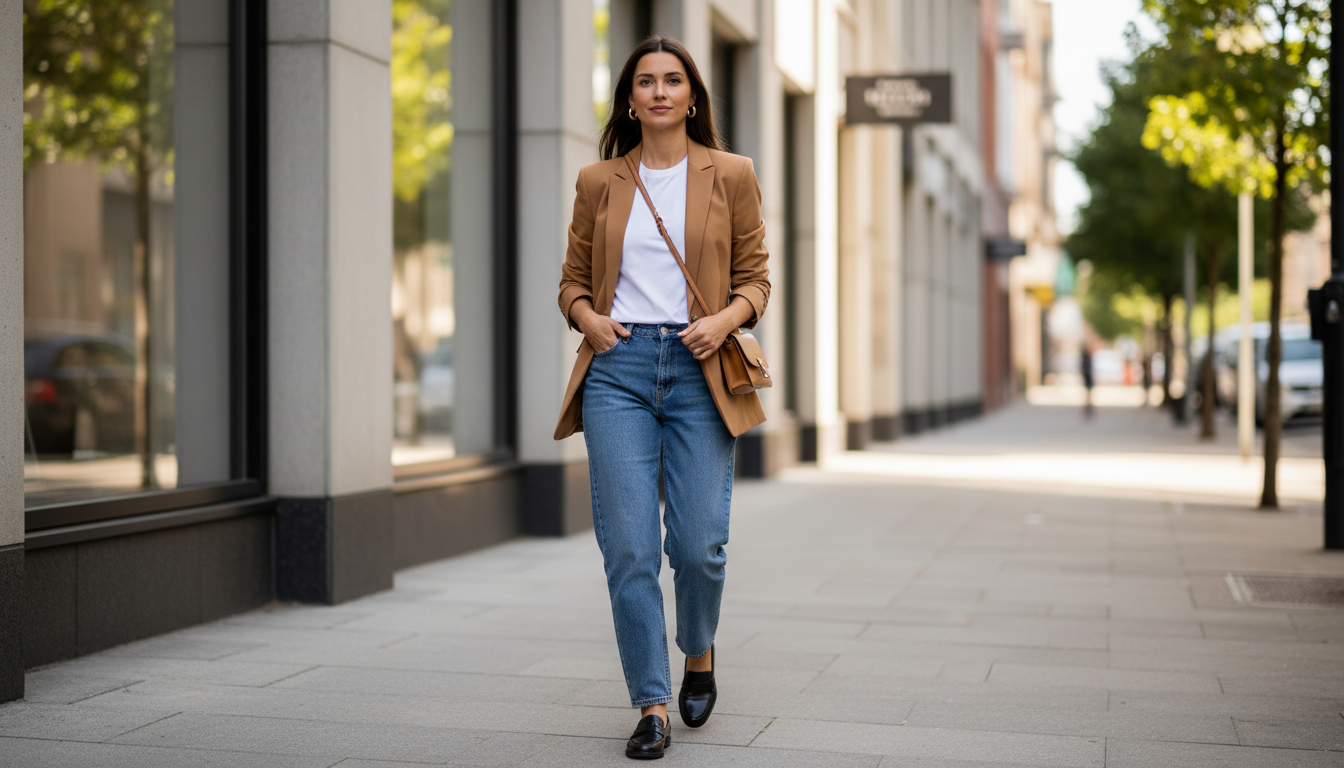 Think of outfit formulas as your outfit autopilot: simple combinations that always land in that sweet spot between relaxed and polished. Instead of starting from zero every morning, you plug in a proven framework and personalize the details. That’s the magic of a capsule wardrobe—fewer, better pieces that mix and match without thinking, delivering casual chic on command. A camel blazer over a white crewneck t-shirt, straight leg jeans, and black loafers is the perfect example: structure meets ease, neutrals feel elevated, and the proportions are flattering without trying too hard. Swap the jeans for tailored trousers and you’re office-ready; throw on a beige trench coat and it instantly reads sophisticated for coffee runs or drizzly commutes. Because the palette is cohesive and the silhouettes are clean, the same formula slides effortlessly from errands to brunch to casual work outfits, and it never looks overdone.