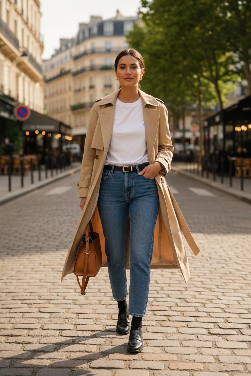 What I love most is how seamlessly it shifts from weekend to work outfits with tiny tweaks—proof that smart style tips beat a crowded closet. Add gold hoops and a structured tote for the office, or switch the trench for a camel blazer on warmer days while keeping everything else the same. On rainy mornings, pop the collar, slip on fine-gauge black socks, and let the trench do the heavy lifting. For evening, swipe on a red lip and swap the everyday belt for something croc-embossed. Colder? Layer a thin turtleneck under the tee or loop on a cashmere scarf; warmer? Try a lightweight tee and loafer mules. The beauty is in the textures: a sturdy cotton tee that isn’t see-through, denim with just enough structure to hold a straight leg, and leather loafers with a gentle shine. This look packs like a dream, photographs beautifully, and always reads intentional. If you’re building your capsule wardrobe checklist, start here: beige trench coat, white crewneck t-shirt, straight leg jeans, black loafers—and keep a camel blazer nearby for instant versatility. Effortless, unfussy, and endlessly repeatable—that’s instant chic.