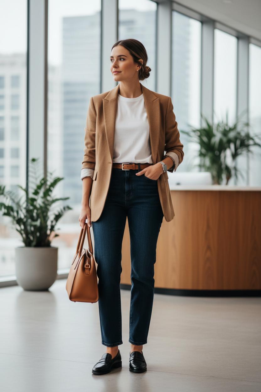 The easiest way to take these outfit formulas from weekend to boardroom is with a few quiet, thoughtful upgrades. Start with the most classic combo: a white crewneck t-shirt and straight leg jeans. Keep the tee crisp, tuck it neatly, add a slim leather belt, and top it with a camel blazer that brings instant structure and warmth. Swap casual sneakers for black loafers with a subtle shine, and suddenly the whole look reads intentional. A structured tote, a sleek watch, and a soft low bun tie the story together—effortless, but clearly office-minded. It’s casual chic elevated by tailoring and texture, the kind of alchemy that makes your morning mirror moment feel easy and pulled-together.