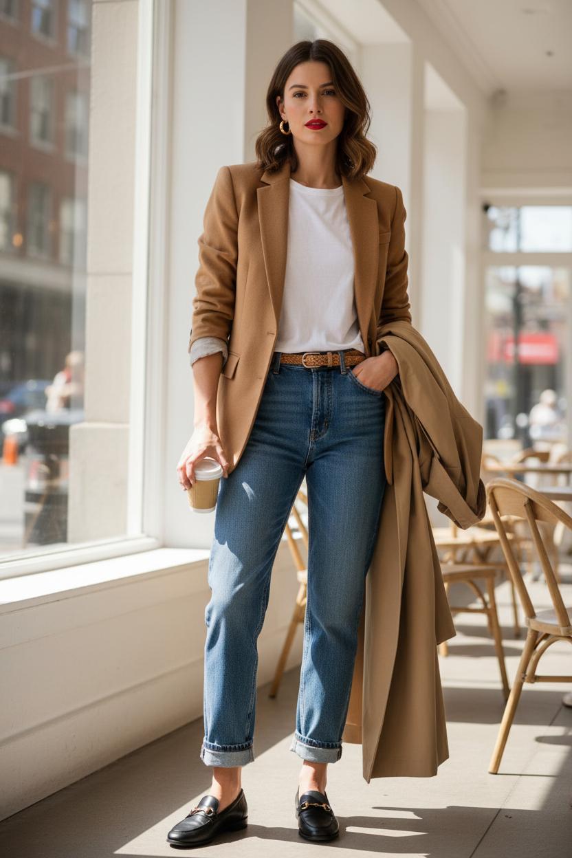 When in doubt, stack your neutrals. Start with a crisp white crewneck t-shirt and your favorite straight leg jeans, then build upward: a tailored camel blazer for clean structure, topped with a swishy beige trench coat for movement and drama. The result is that casual chic magic that looks like you put in effort, even if you got dressed in five minutes. The key is playing with lengths and weights—let the blazer hit at the hip or just below, and choose a trench that’s a touch longer so the lapels and hems peek out with intention. Finish with black loafers to ground the palette and add a subtle, menswear-inspired polish. This is one of those outfit formulas you can rely on year-round: light layers for spring and fall, and when it’s cooler, swap the tee for a merino crew or add a thin cashmere scarf without disturbing the clean lines.