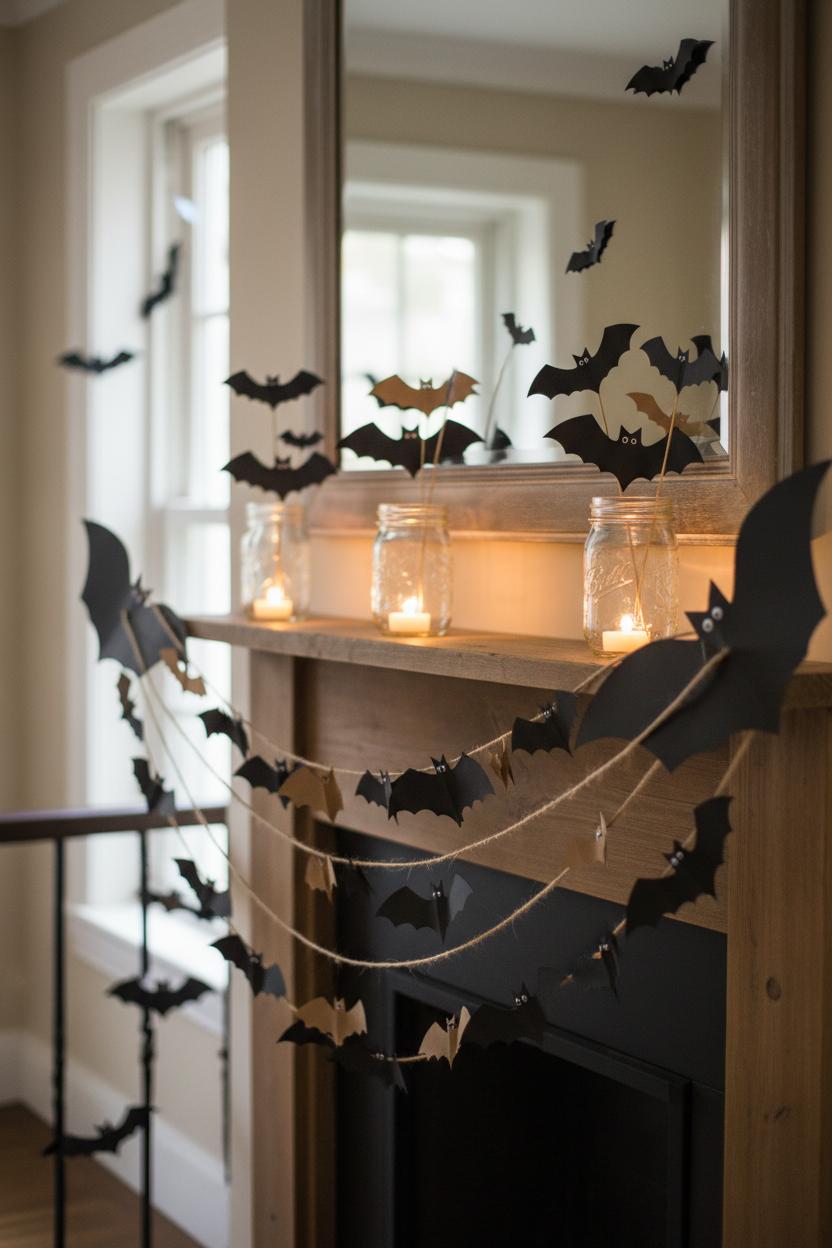 Once your garland is strung, drape it along a mirror, swag it across your mantel, or line a stair banister for maximum swoop effect. For an extra cozy twist, turn this into a whole vignette: cluster a few mason jars filled with mini LED tea lights, then perch spare bats on the jar rims or tape them to wooden skewers for a flickering “bat forest.” It’s one of those halloween diy crafts that looks surprisingly polished, yet it’s approachable enough for a rainy afternoon of fall crafts with the kids. Mix in a second strand made from kraft paper for contrast, or cut a few oversized bats to anchor the ends. If you want to extend the look to windows, a bit of washi tape on the back of each bat makes for easy, residue-free removal. Store your garland flat in a large envelope when November rolls around, and it will be ready to flutter again next year. Simple supplies like black cardstock, twine, and a steady hand are all you need to elevate your space with sweetly spooky home decor—no elaborate tools required.