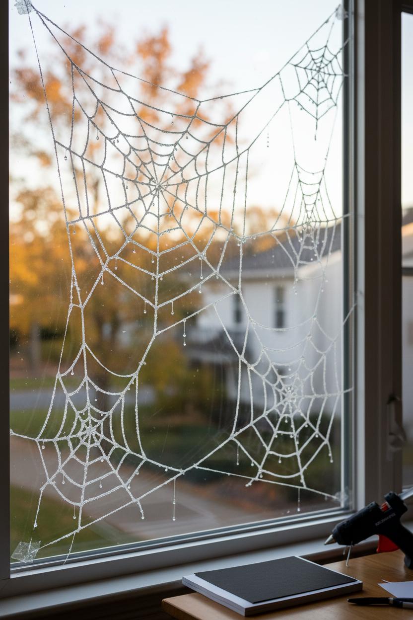 If you’ve got a hot glue gun and ten spare minutes, you can spin your own spiderwebs that cling right to the window—no mess, no special supplies, just instant easy halloween decor that looks like frosted lace in the daylight and eerie filigree at night. Lay a sheet of parchment or a silicone baking mat over a simple guide (I slide a piece of black cardstock underneath and sketch a quick web with a pencil), then trace the lines with warm glue. Vary the pressure to get thicker “anchor” strands and whisper-thin threads between them, and add a few dangling “dew drops” for drama. Once the glue cools, peel off the web and press it to clean glass; the flexible glue hugs the surface, but a tiny dot of clear tape at the corners keeps everything perfectly placed through October’s breezes. These look incredible clustered in window corners, across mirrors, or even on glass-front cabinets for instant spooky home decor.