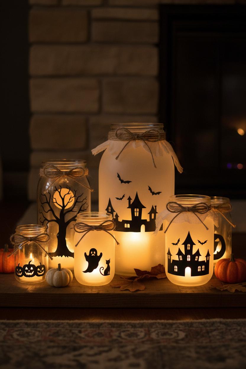 If you’re looking for easy halloween decor that feels cozy by day and wonderfully eerie by night, these haunted mason jar lanterns are a must-try. Gather a few mason jars (mixing sizes looks charming), black cardstock, twine, mini LED tea lights, and a hot glue gun. Cut simple silhouettes from the cardstock—think little haunted houses with pointy roofs, crooked trees, bats, cats, or floating ghosts—and play with scale so each jar tells its own tiny story. Attach your shapes to the outside of the glass with a few dots of hot glue; for a softer, kid friendly halloween crafts option, use clear tape or glue dots so little hands can help without the heat. Wrap the jar rims with twine, tying small bows or trailing ends for a rustic, “found-in-the-attic” feel. Drop in the mini LED tea lights and watch the golden flicker cast crisp shadows of your spooky cutouts, turning a shelf, mantel, or windowsill into a whispery, candlelit vignette. They’re wonderfully portable, too—line your porch steps for trick-or-treat night or cluster three on a tray with tiny pumpkins for an inviting centerpiece that bridges cute and creepy.
