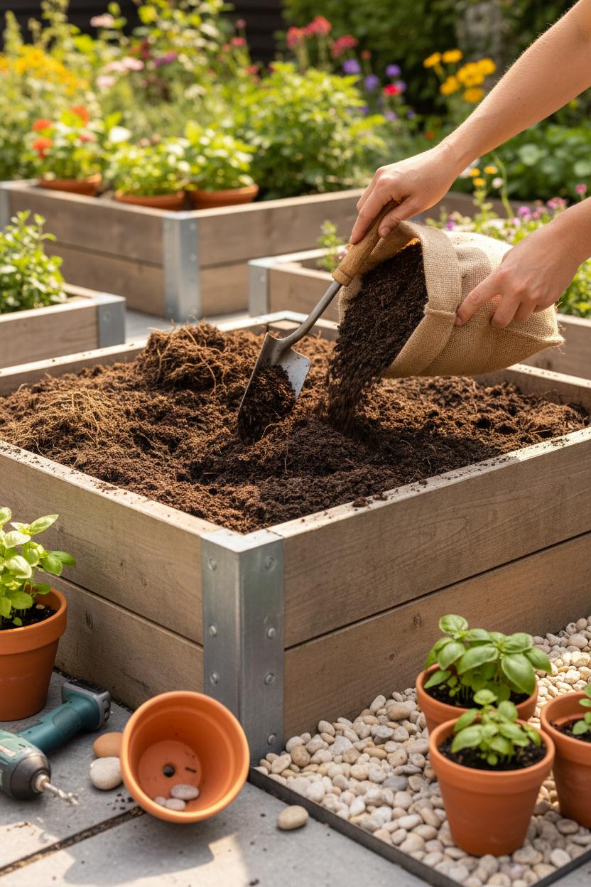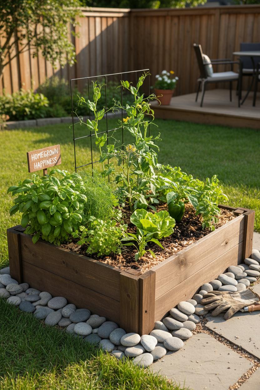 Before you fill, try one of my favorite small garden hacks: lay flattened cardboard or a thick layer of newspaper right on the grass to smother weeds. Then pour in a fluffy blend of garden soil and compost, mounding it slightly so it settles level after the first watering. You can tuck in a handful of slow-release fertilizer if your mix is plain, then water thoroughly until the soil darkens and feels springy. Planting is the fun part. Scatter herb seeds along one side for a mini kitchen garden—basil, cilantro, and dill sprout quickly—or pop in a few starter plants like lettuce, cherry tomatoes, or peppers for that instant “green” moment. Edge the bed with a light topping of mulch to keep moisture in, or frame the outside with landscaping pebbles to define the space and keep splashes off your paths. For tiny yards, add a narrow trellis at the back and let peas or cucumbers climb; vertical growth is a classic of clever DIY garden ideas and saves precious square footage.