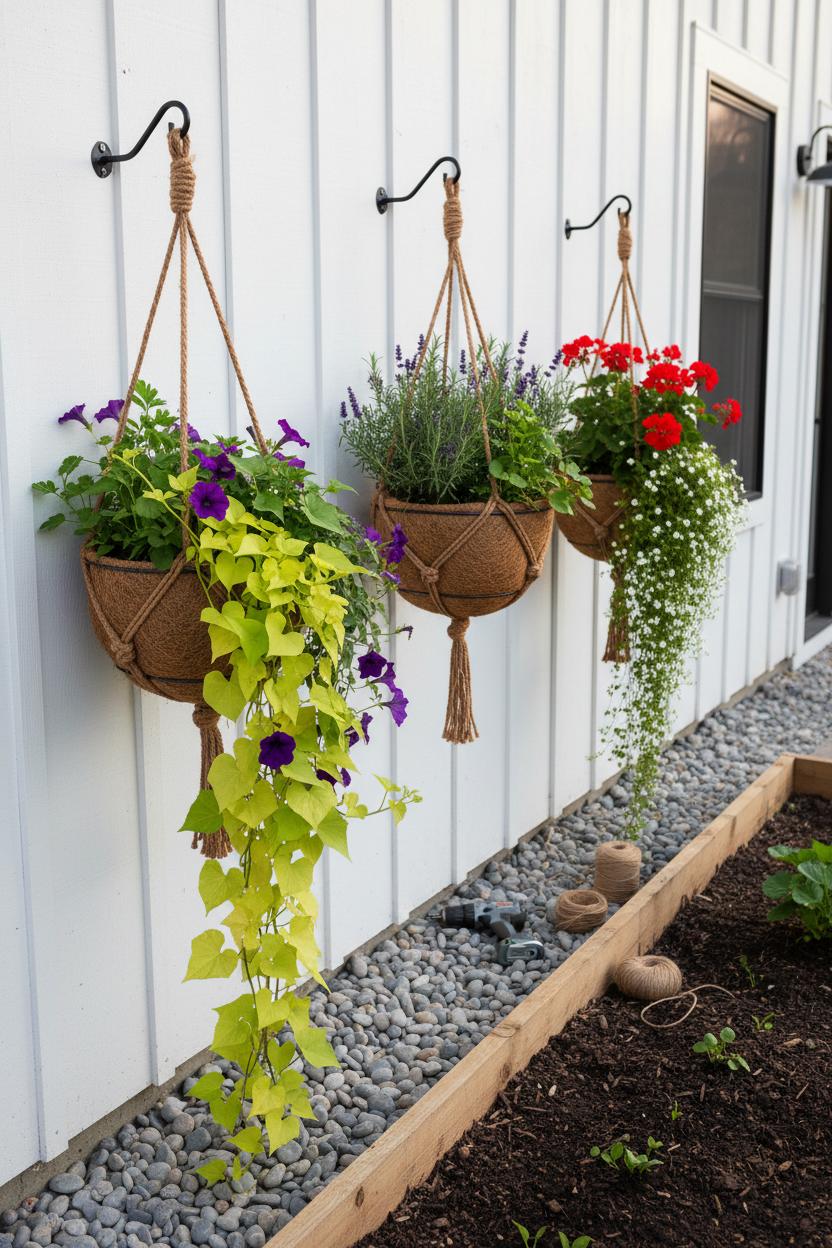 If you’re craving easy backyard upgrades that make a big visual impact, grab a cordless drill and start by hanging a few planters where you’ll see them every day—by the back door, along a sunny fence, or under a covered porch. Measure and mark your spots, pre-drill pilot holes, then install sturdy exterior hooks or screws and let the layers happen: a mix of trailing vines, flowering annuals, and a couple of herb seeds tucked into small pots for snipping at dinnertime. Fill planters with quality garden soil so watering stays consistent, and consider a narrow strip of landscaping pebbles underneath to keep splash-back off your siding and add a tidy, modern edge. This is one of those simple garden projects that turns blank space into a lush little living wall in under an hour—perfect for weekend gardening and tiny patios alike. It’s also one of my favorite small garden hacks because it lifts plants to eye level, where every leaf looks intentional.