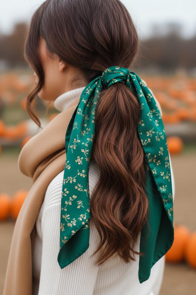 The braid wrap is equally dreamy and surprisingly practical—your hair stays put while looking intentional. Start with a low pony, knot the scarf at the base, then treat the scarf as one of your three strands and braid down, tying off with a small elastic or sliding on a scarf ring at the tip. For a smoother finish, pick a satin hair scarf; for a glossier pop, go with a silk scarf; if you love volume, choose a slightly larger square scarf and let the ends flutter. Think rich jewel tones or micro florals for fall fashion tips that photograph beautifully, and echo the colors in your bag or lipstick for easy, pulled-together scarf outfit ideas. On breezy days, a couple discreet bobby pins at the knot keep everything anchored.