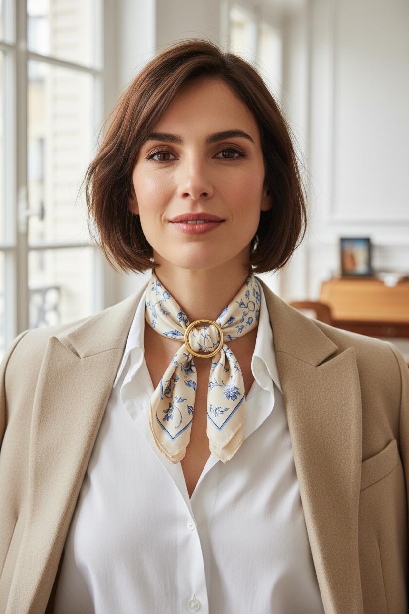 Here’s the easiest way to master it. Lay your square scarf flat, fold corner to corner into a triangle, then roll from the long edge into a smooth band. For the classic Parisian loop, fold that band in half, drape it around your neck, and slide the free ends through the folded loop at the front. Gently snug it up—never too tight—then nudge the knot slightly to one side for that undone, French-girl finish. Prefer a softer drop? Skip the fold-in-half step and tie a single loose overhand knot close to your collarbone, letting the tails skim your lapel. A scarf ring is a lovely shortcut for slippery silks, adding a jewelry-like touch while keeping everything in place. And if you’re playing with a satin hair scarf, the same fold-and-loop trick works around a ponytail or the handle of your tote for a coordinated moment.