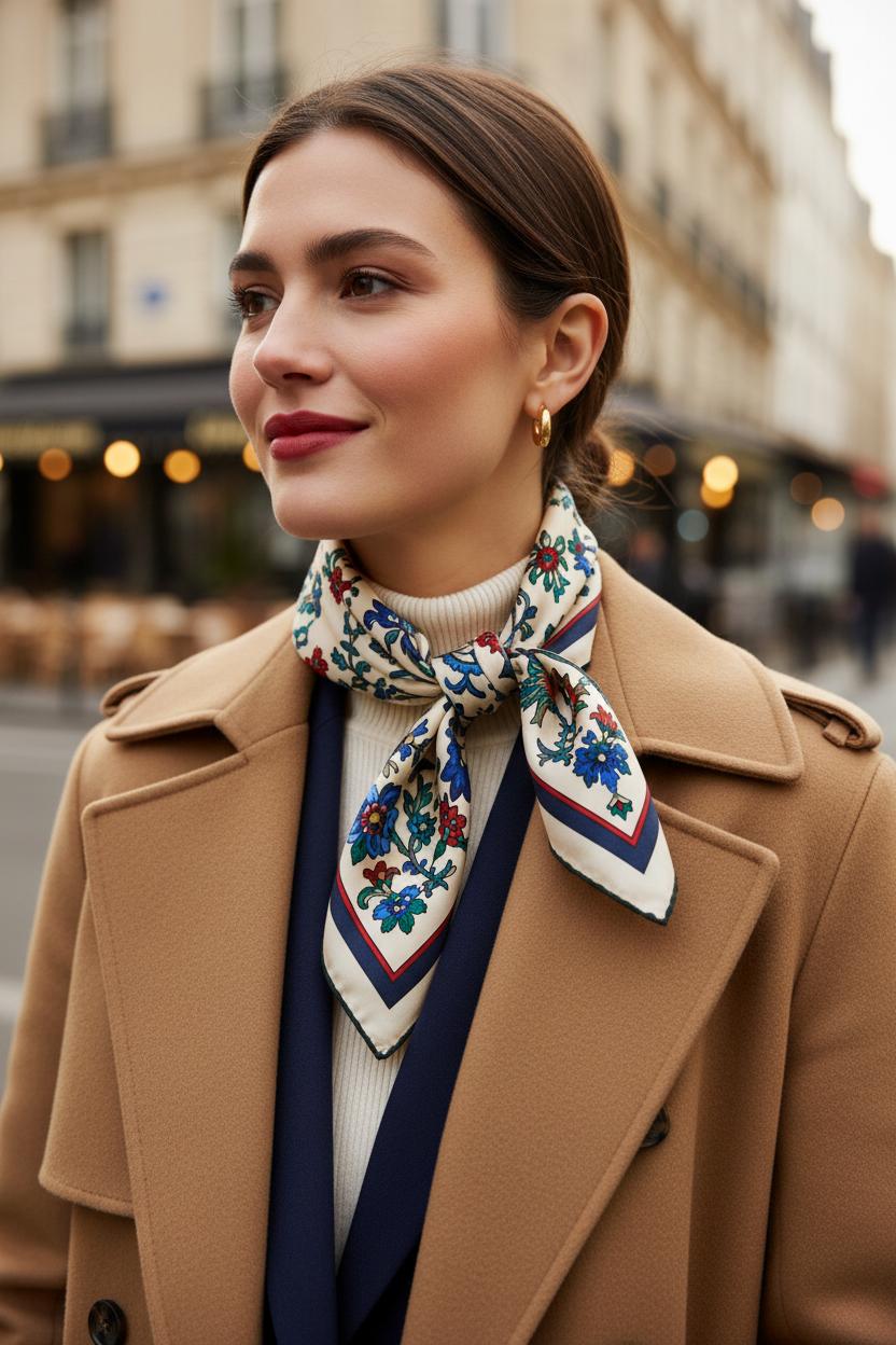 For scarf outfit ideas, think stripes, denim, and a camel trench; a navy blazer with gold hoops and a red lip; or layered over a fitted turtleneck with wide-leg trousers. On chilly mornings, translate the technique to a lightweight wool scarf for extra warmth without bulk. My fall fashion tips: lean into jewel tones, let prints pop against neutrals, and mix textures—silk against tweed is always a yes. Keep the knot relaxed, the tails uneven, and your neckline clean; the magic of the Parisian knot is how it makes everything else look intentional.